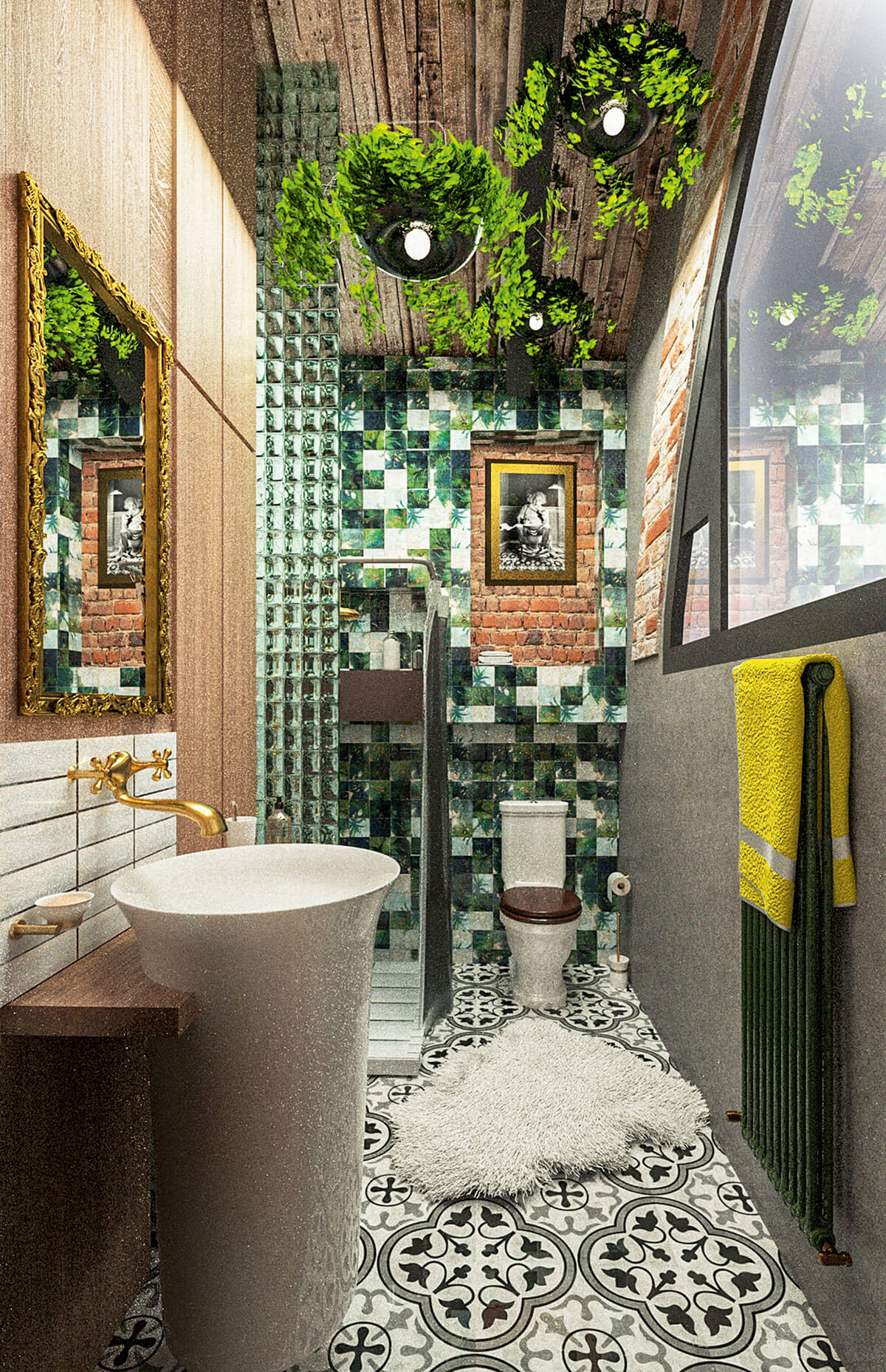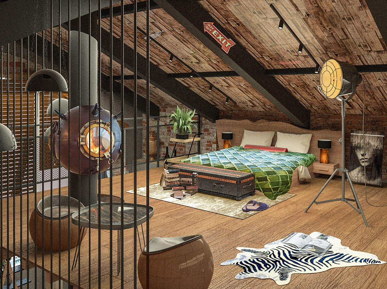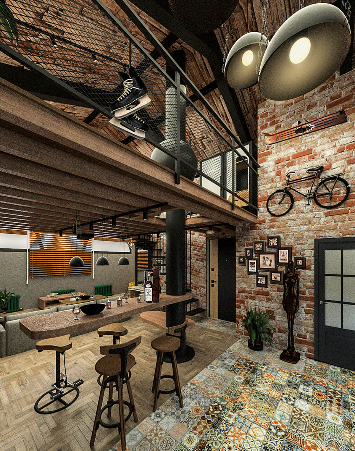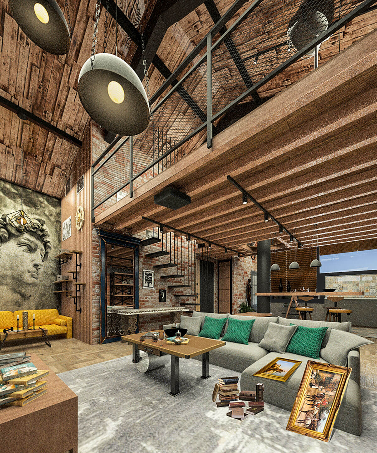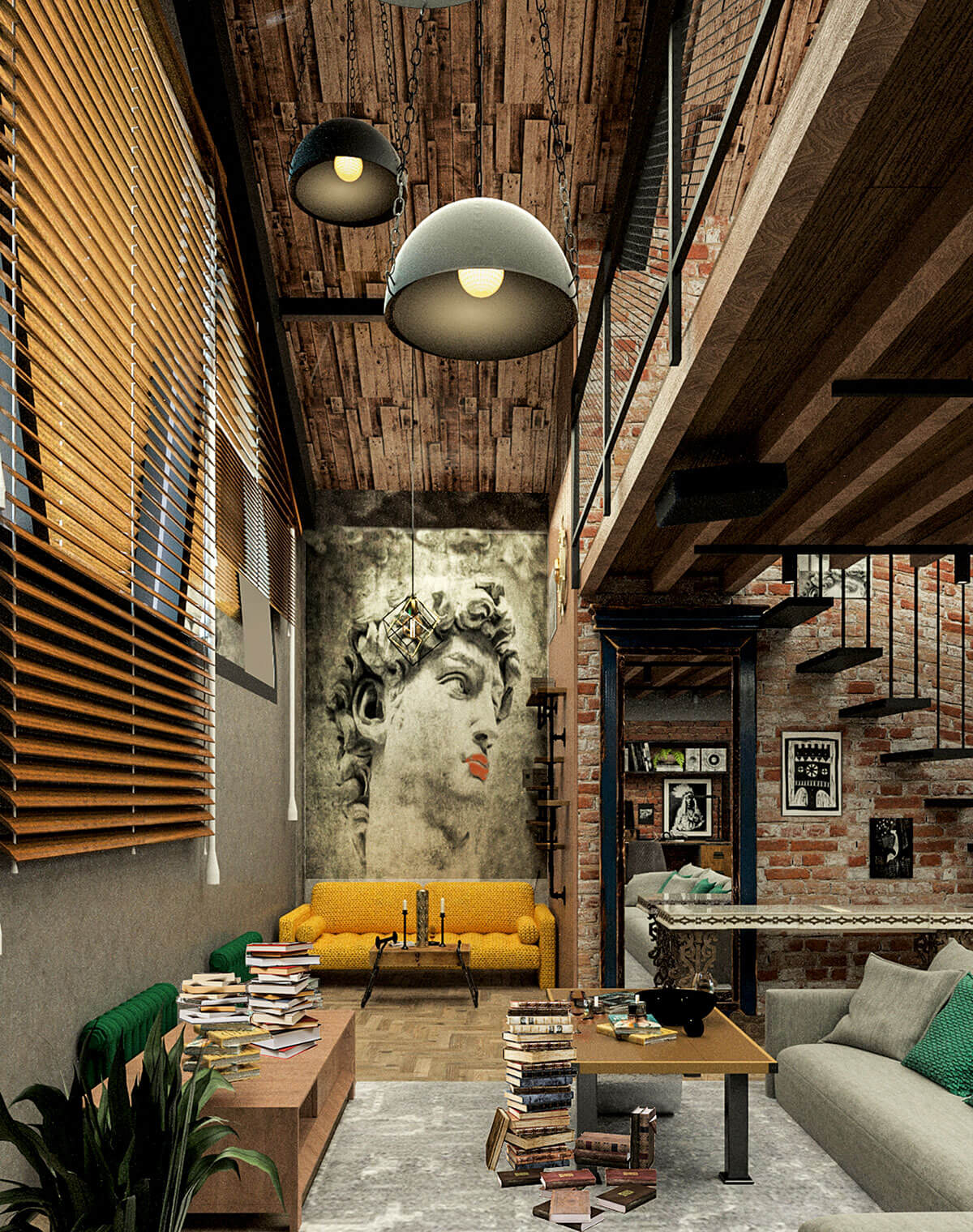 Проект продуман так, чтобы все пространства были открытыми, наполненными светом и воздухом, а все зоны максимально функциональными. Имеющиеся в квартире кирпичные стены, металлические балки и старая труба от мусоропровода стали прекрасной основой для интерьера, решенного в стиле лофт. Стояк бывшего мусоропровода, дополненный авторами скамьей и полкой оригинальных форм на первом этаже и электро-камином на втором, превратился в один из главных дизайнерских элементов жилого пространства. Контрастное оформление санузла удачно подчеркнуто озеленением. Эмоциональной выразительности архитекторы достигли с помощью предметного декора—картин, старых скульптур, книжных систем и светильников.
