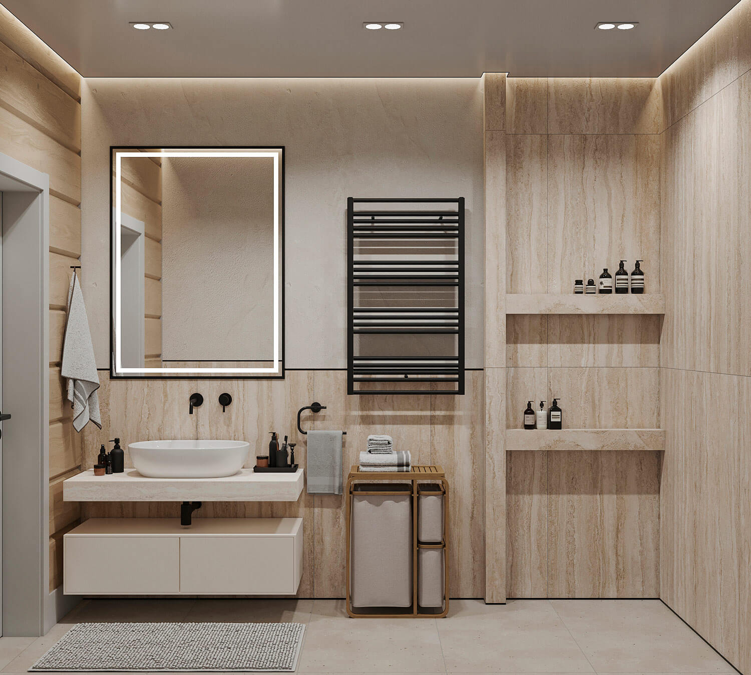 Интерьер современной усадьбы сделан с элементами стиля эко-минимализма. Заказчикам хотелось тишины, спокойствия, отсутствия визуального шума для полноценного отдыха и восстановления после работы. Поэтому весь интерьер выполнен в нейтрально-бежевых оттенках, сочетая в себе такие материалы, как дерево, камень, стекло и декоративную штукатурку.