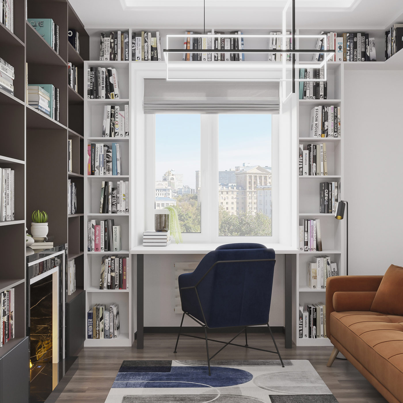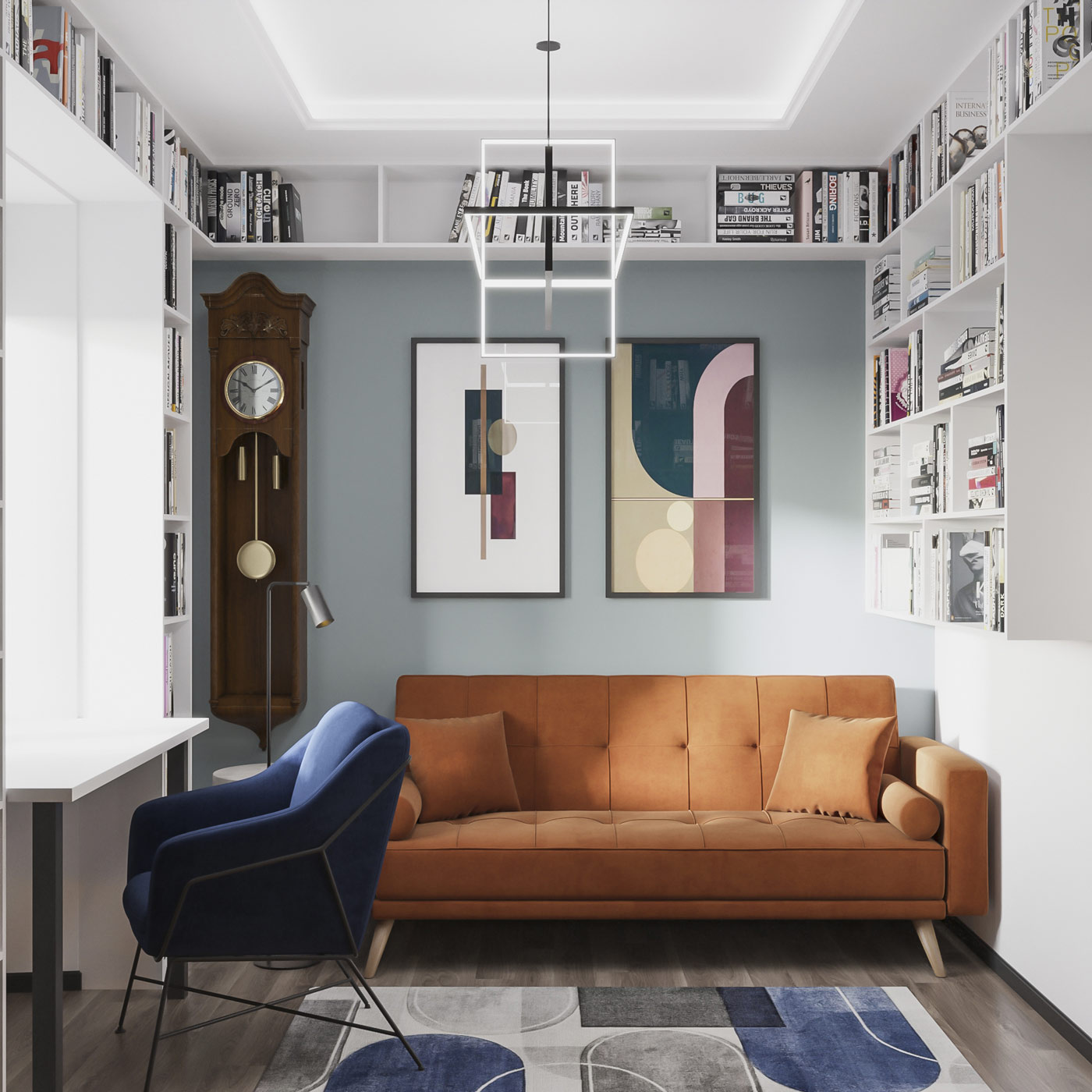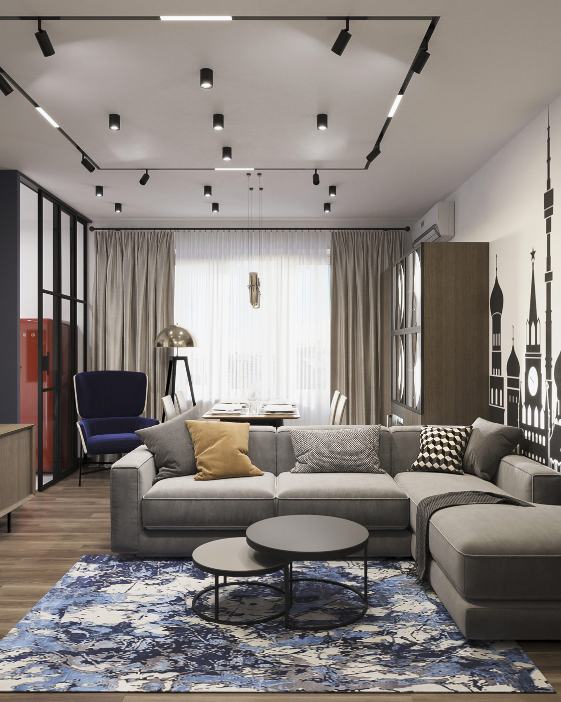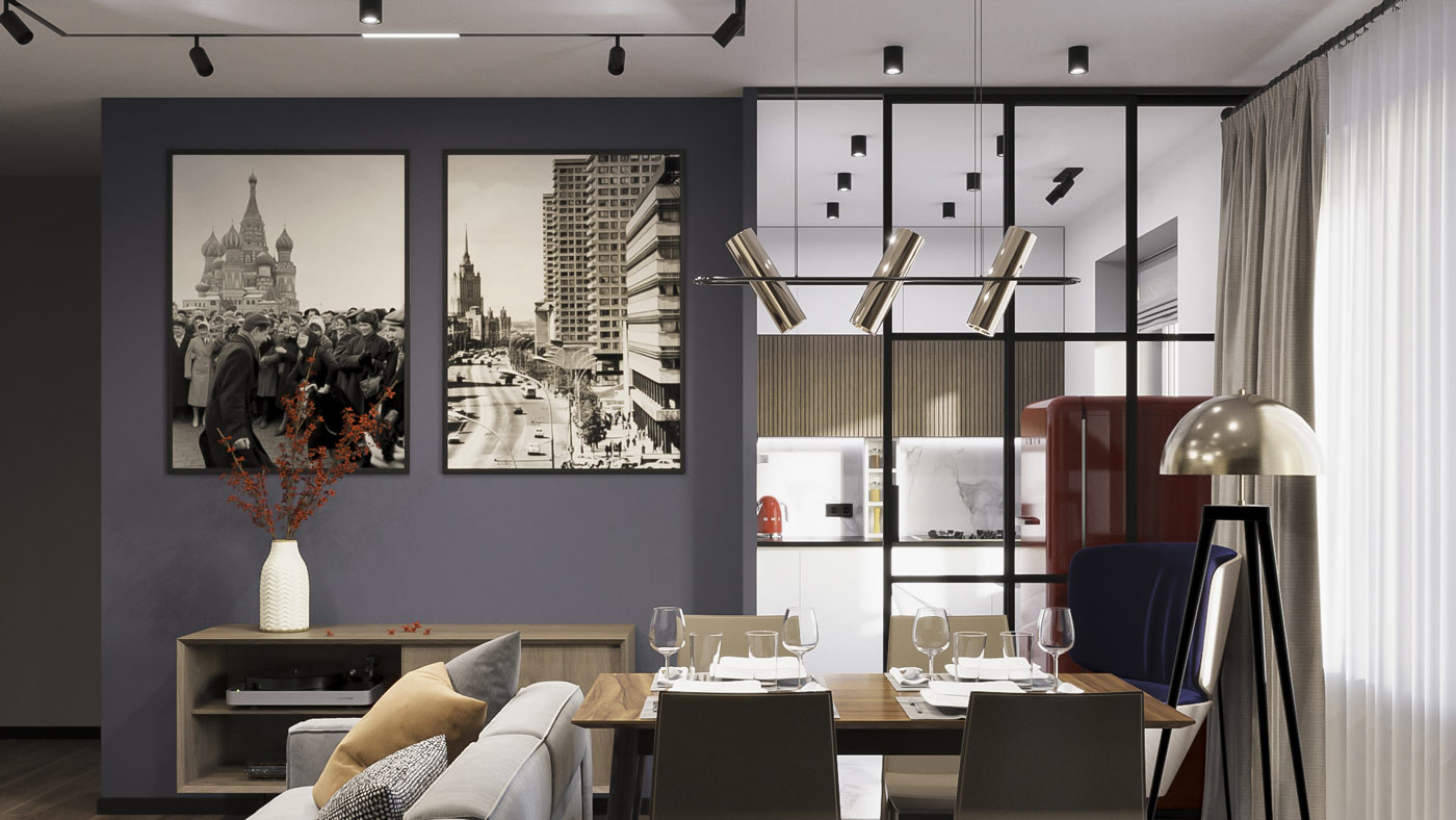 Перед архитектором стояла интересная задача – создать стильный интерьер, но привнести в него частичку уюта и ностальгии. При создании дизайна было очень важно найти подходящее место для личных «исторических» деталей заказчика, таких как старинные настенные часы, собрание книг, исторические карты городов. Чтобы воссоздать советскую эпоху, архитектор внимательно отнесся к подбору мебели, так как именно она привнесла в интерьер настроение ностальгии. В сочетании с неброскими оттенками стен, в интерьере использовались яркие акценты. При входе в квартиру расположилась вместительная мебельная стенка – консоль с пуфом, а напротив массивное зеркало в пол, что придало прихожей еще больше визуального пространства. Из коридора можно сразу попасть в зону библиотеки с уютным электрокамином, и рабочим столом. Зона спальни помимо основного помещения, имеет еще вместительный скрытый гардероб, а около окна, обустроенную мягкую зону для релакса, где можно уютно устроиться с ноутбуком и за чашкой кофе посмотреть свежие новости. В ванной комнате удалось создать весьма функциональную планировку (душевая кабина, ванна, вместительный шкаф со встроенной стиральной машиной), а главное яркий акцент в мебели, который отлично смотрится на фоне мраморной текстуры. Отдельное внимание занимает зона гостиной – кухни. Помимо яркого акцента стен и старинных картин, архитектор предложил создать интересный прием в виде декоративной росписи на стене. Чтобы добавить в современный интерьер шарм «советского стиля» достаточно использовать несколько характерных мебельных элементов (комод для посуды, диван с журнальным столиком, торшер, уютное мягкое кресло). За диваном размещается обеденный стол на 4 места, расположение стола не загромождает пространство и имеет удобное расположение относительно ТВ стены. Кухня отделена от спальни раздвижной строгой остекленной перегородкой с раздвижной дверью, за которой виден холодильник в «ретро» стиле. Так же перед архитектором стояла важная задача задекорировать элемент газовой трубы чтобы сэкономить место в пространстве кухни, получился стильный прием в виде декоративной заглушки с полочками под специи, которую можно в любой момент убрать и получить доступ к коммуникациям. Обустройство лоджии так же стало интересной задачей, там разместились вместительный встроенный шкаф для хранения, уютное кресло с компактным столиком для работы, необычный барная группа, а самое интересное – настоящие качели, которые помогут отвлечься от бытовых проблем и станут мостом притяжения гостей на домашних встречах.