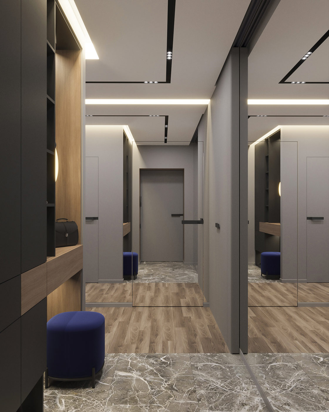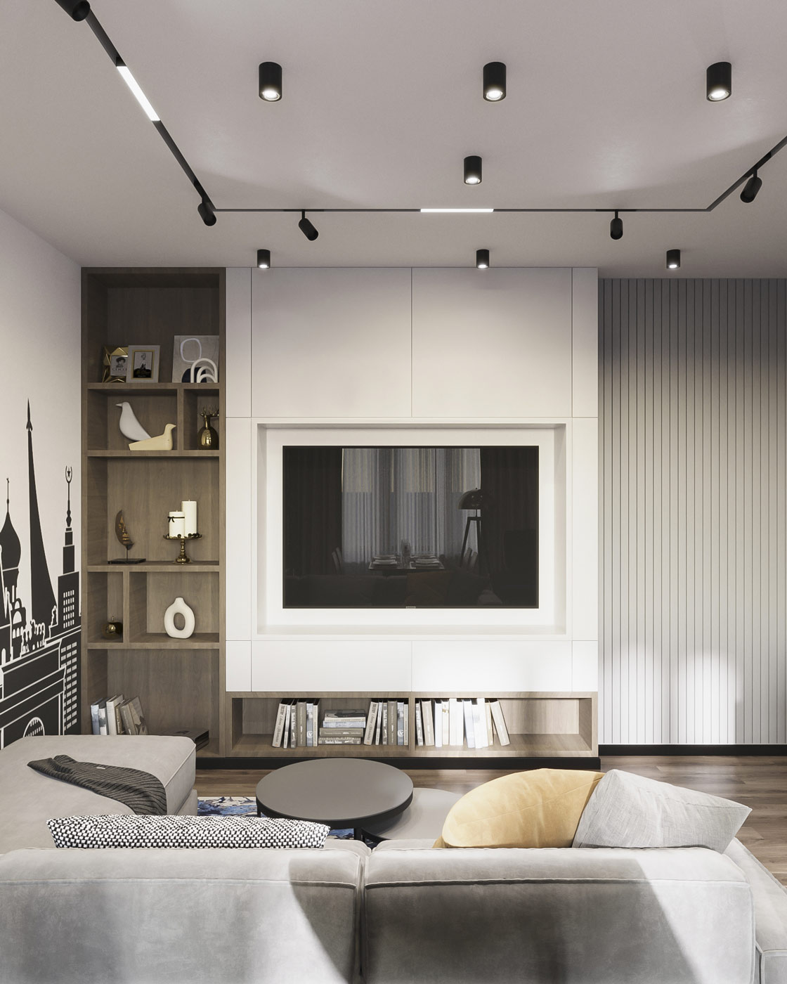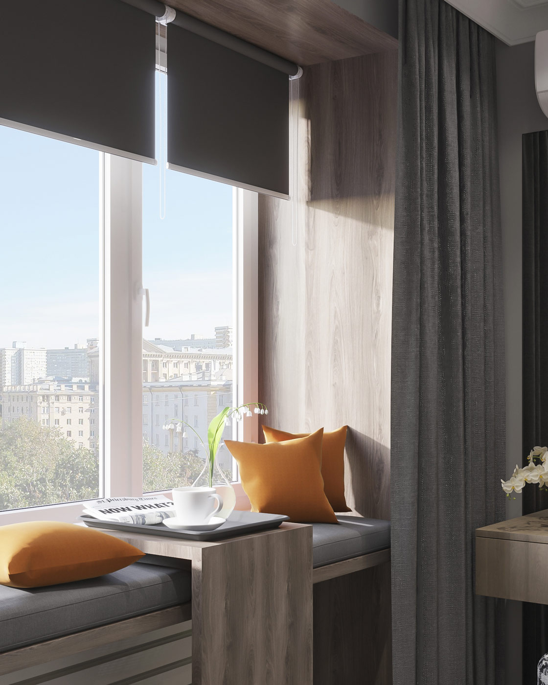 Перед архитектором стояла интересная задача – создать стильный интерьер, но привнести в него частичку уюта и ностальгии. При создании дизайна было очень важно найти подходящее место для личных «исторических» деталей заказчика, таких как старинные настенные часы, собрание книг, исторические карты городов. Чтобы воссоздать советскую эпоху, архитектор внимательно отнесся к подбору мебели, так как именно она привнесла в интерьер настроение ностальгии. В сочетании с неброскими оттенками стен, в интерьере использовались яркие акценты. При входе в квартиру расположилась вместительная мебельная стенка – консоль с пуфом, а напротив массивное зеркало в пол, что придало прихожей еще больше визуального пространства. Из коридора можно сразу попасть в зону библиотеки с уютным электрокамином, и рабочим столом. Зона спальни помимо основного помещения, имеет еще вместительный скрытый гардероб, а около окна, обустроенную мягкую зону для релакса, где можно уютно устроиться с ноутбуком и за чашкой кофе посмотреть свежие новости. В ванной комнате удалось создать весьма функциональную планировку (душевая кабина, ванна, вместительный шкаф со встроенной стиральной машиной), а главное яркий акцент в мебели, который отлично смотрится на фоне мраморной текстуры. Отдельное внимание занимает зона гостиной – кухни. Помимо яркого акцента стен и старинных картин, архитектор предложил создать интересный прием в виде декоративной росписи на стене. Чтобы добавить в современный интерьер шарм «советского стиля» достаточно использовать несколько характерных мебельных элементов (комод для посуды, диван с журнальным столиком, торшер, уютное мягкое кресло). За диваном размещается обеденный стол на 4 места, расположение стола не загромождает пространство и имеет удобное расположение относительно ТВ стены. Кухня отделена от спальни раздвижной строгой остекленной перегородкой с раздвижной дверью, за которой виден холодильник в «ретро» стиле. Так же перед архитектором стояла важная задача задекорировать элемент газовой трубы чтобы сэкономить место в пространстве кухни, получился стильный прием в виде декоративной заглушки с полочками под специи, которую можно в любой момент убрать и получить доступ к коммуникациям. Обустройство лоджии так же стало интересной задачей, там разместились вместительный встроенный шкаф для хранения, уютное кресло с компактным столиком для работы, необычный барная группа, а самое интересное – настоящие качели, которые помогут отвлечься от бытовых проблем и станут мостом притяжения гостей на домашних встречах.