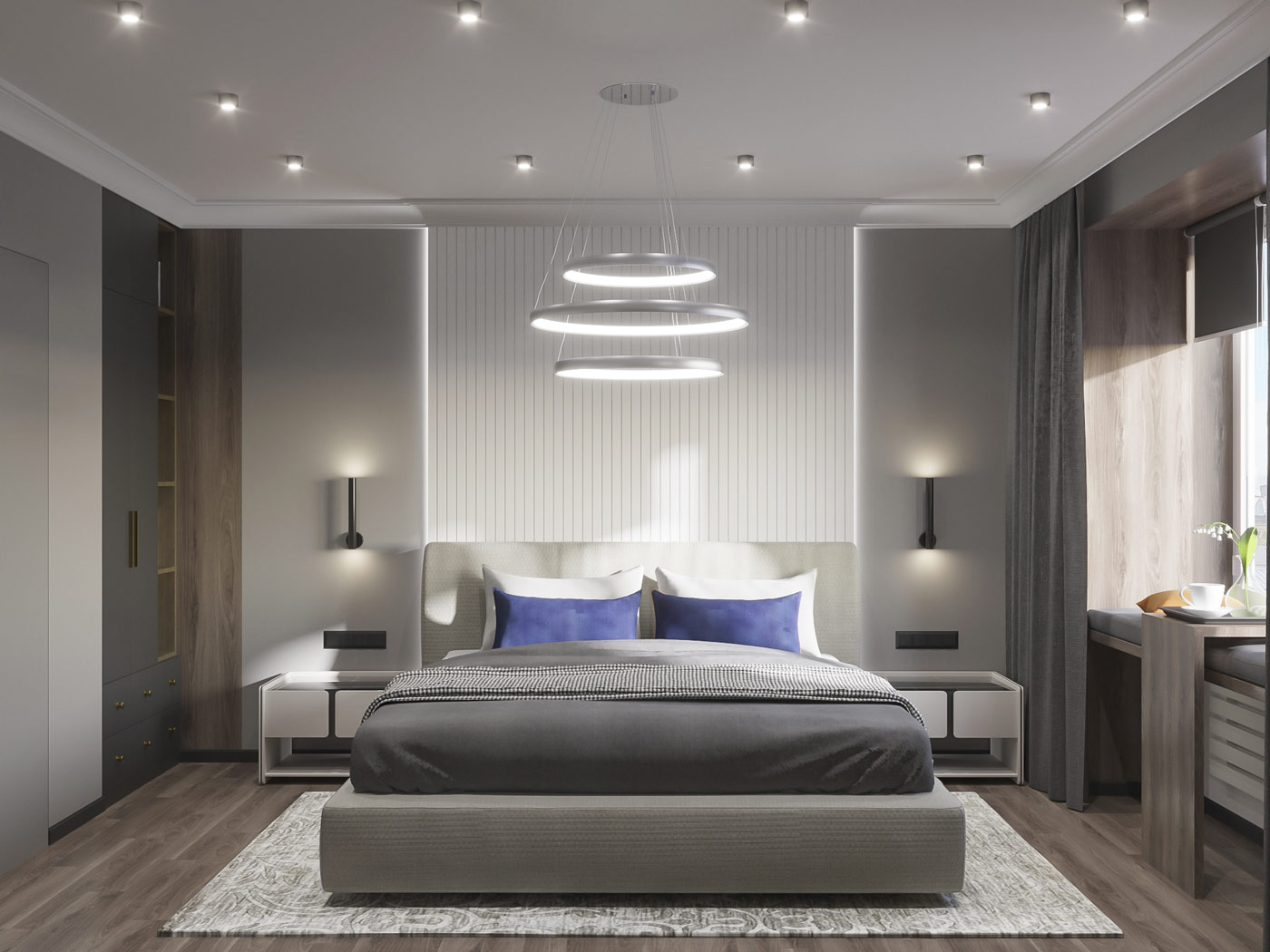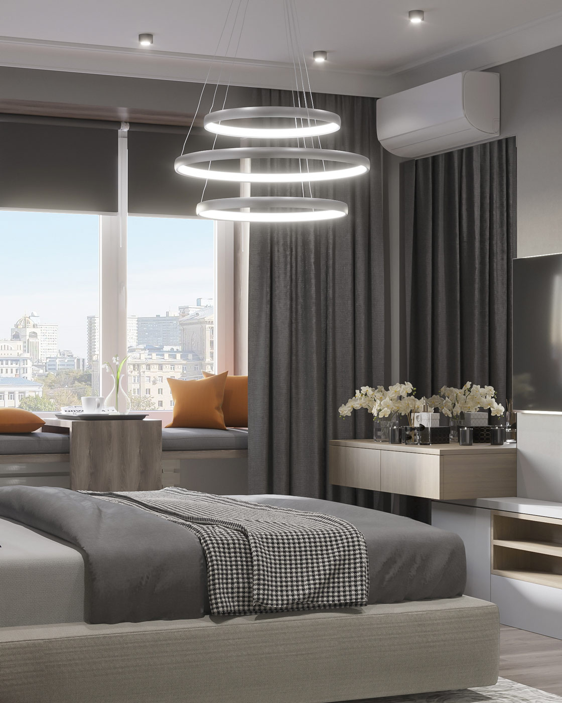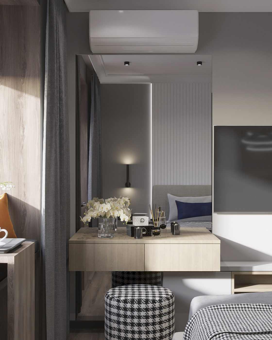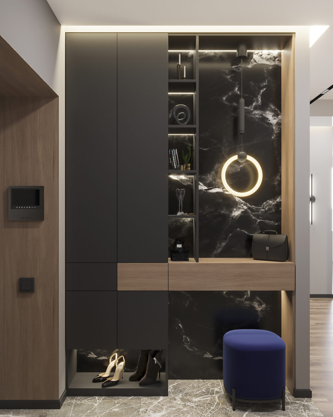 Перед архитектором стояла интересная задача – создать стильный интерьер, но привнести в него частичку уюта и ностальгии. При создании дизайна было очень важно найти подходящее место для личных «исторических» деталей заказчика, таких как старинные настенные часы, собрание книг, исторические карты городов. Чтобы воссоздать советскую эпоху, архитектор внимательно отнесся к подбору мебели, так как именно она привнесла в интерьер настроение ностальгии. В сочетании с неброскими оттенками стен, в интерьере использовались яркие акценты. При входе в квартиру расположилась вместительная мебельная стенка – консоль с пуфом, а напротив массивное зеркало в пол, что придало прихожей еще больше визуального пространства. Из коридора можно сразу попасть в зону библиотеки с уютным электрокамином, и рабочим столом. Зона спальни помимо основного помещения, имеет еще вместительный скрытый гардероб, а около окна, обустроенную мягкую зону для релакса, где можно уютно устроиться с ноутбуком и за чашкой кофе посмотреть свежие новости. В ванной комнате удалось создать весьма функциональную планировку (душевая кабина, ванна, вместительный шкаф со встроенной стиральной машиной), а главное яркий акцент в мебели, который отлично смотрится на фоне мраморной текстуры. Отдельное внимание занимает зона гостиной – кухни. Помимо яркого акцента стен и старинных картин, архитектор предложил создать интересный прием в виде декоративной росписи на стене. Чтобы добавить в современный интерьер шарм «советского стиля» достаточно использовать несколько характерных мебельных элементов (комод для посуды, диван с журнальным столиком, торшер, уютное мягкое кресло). За диваном размещается обеденный стол на 4 места, расположение стола не загромождает пространство и имеет удобное расположение относительно ТВ стены. Кухня отделена от спальни раздвижной строгой остекленной перегородкой с раздвижной дверью, за которой виден холодильник в «ретро» стиле. Так же перед архитектором стояла важная задача задекорировать элемент газовой трубы чтобы сэкономить место в пространстве кухни, получился стильный прием в виде декоративной заглушки с полочками под специи, которую можно в любой момент убрать и получить доступ к коммуникациям. Обустройство лоджии так же стало интересной задачей, там разместились вместительный встроенный шкаф для хранения, уютное кресло с компактным столиком для работы, необычный барная группа, а самое интересное – настоящие качели, которые помогут отвлечься от бытовых проблем и станут мостом притяжения гостей на домашних встречах.