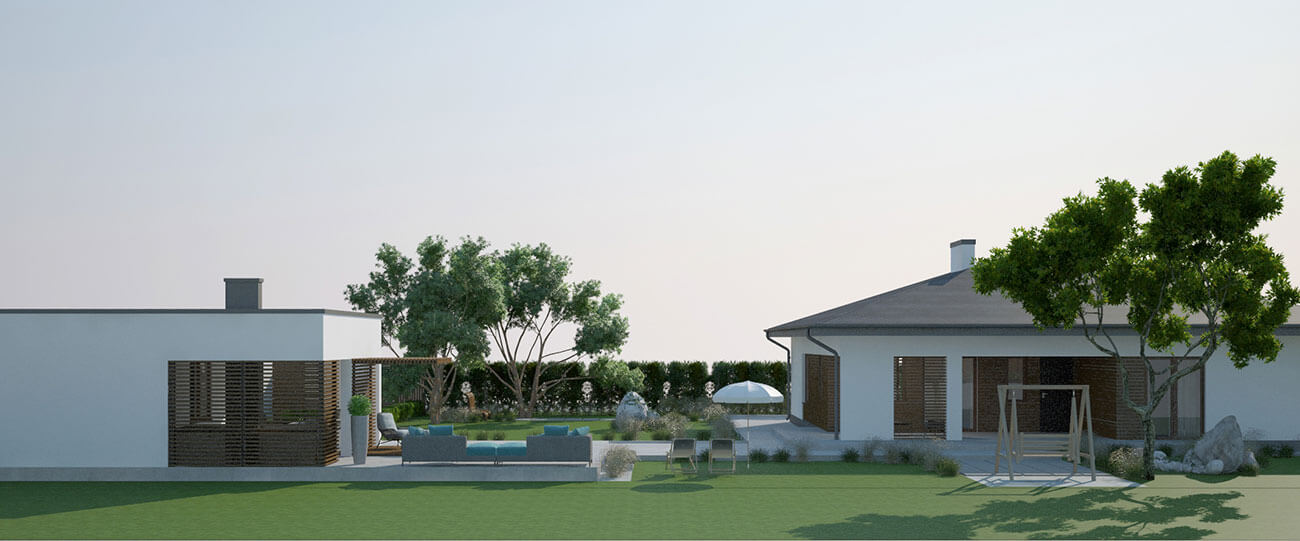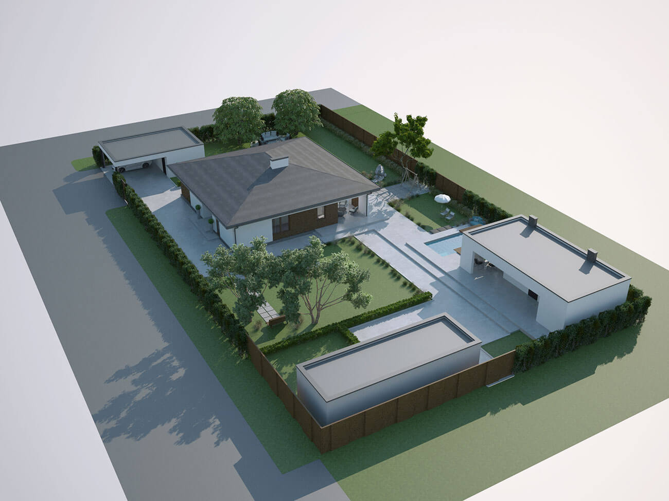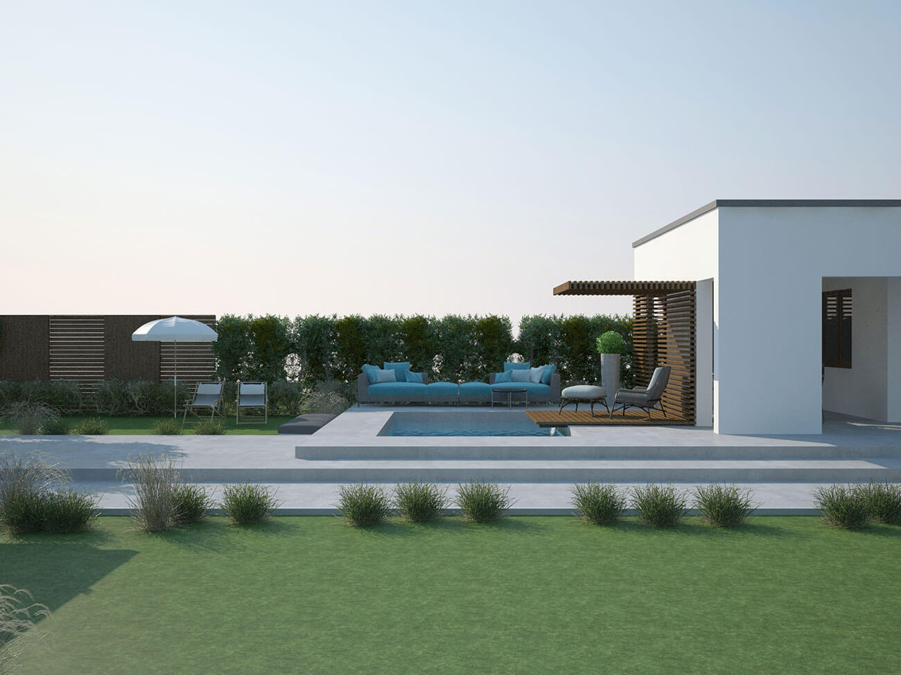 Примечательной деталью комплекса является бассейн с перголой, который расположен в отдельно стоящем объеме. Он является доминантой в композиции двора. Здесь самое динамичное и посещаемое место. Его расположение выполнено таким образом, что красота уютного уголка открывается практически со всех ракурсов участка, а с видовой террасы бассейна есть возможность обозревать живописные участки комплекса. Прослеживается функциональная архитектурная связь террасы дома и террасы бассейна (чтобы подчеркнуть важность этих двух архитектурных объектов).