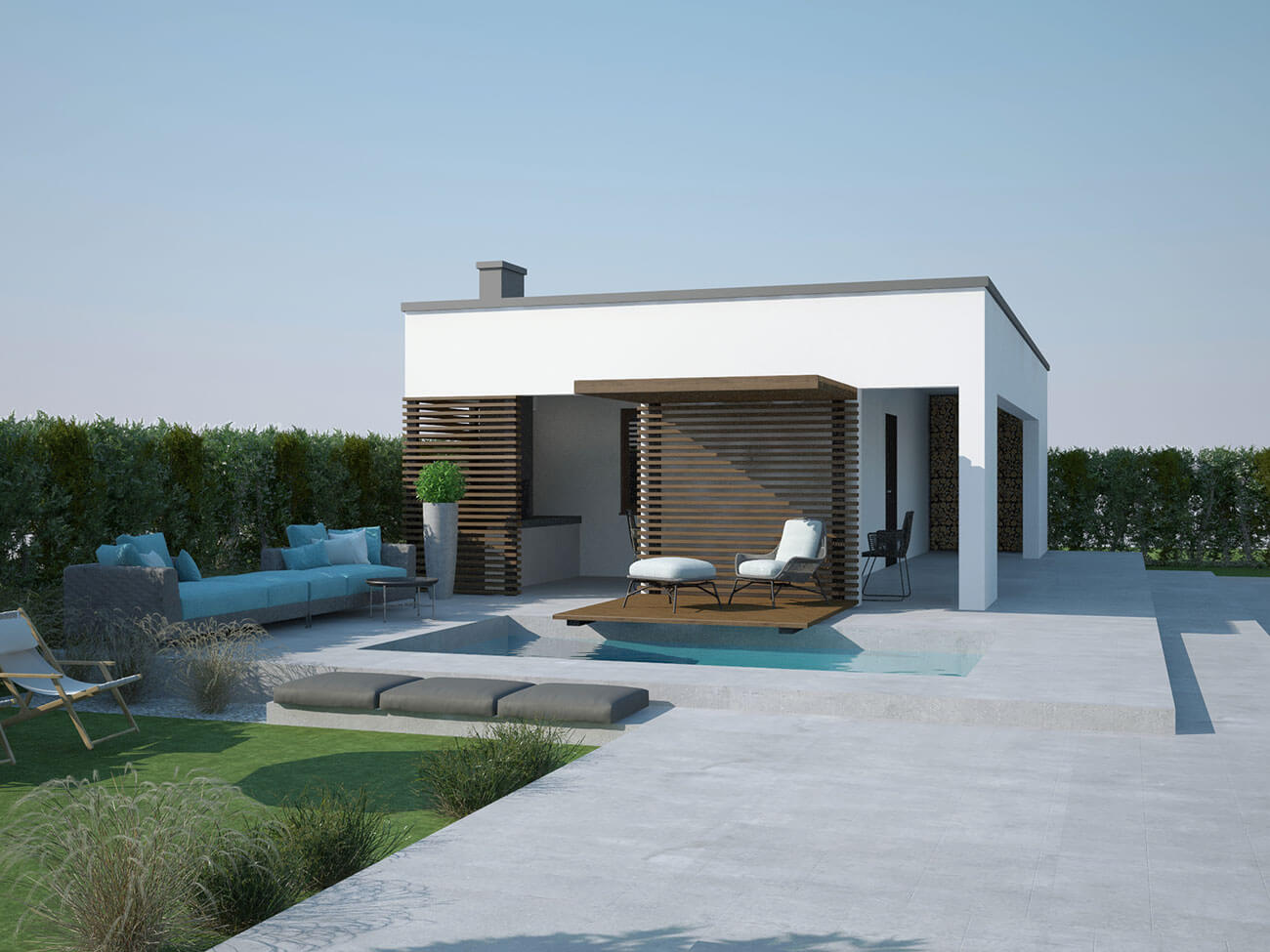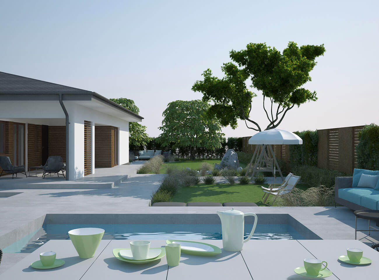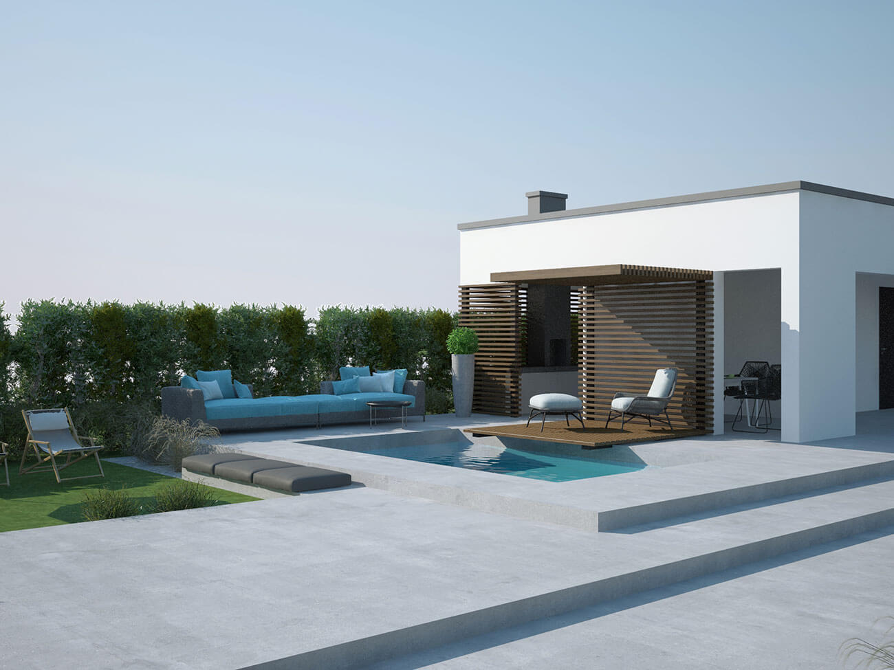 Примечательной деталью комплекса является бассейн с перголой, который расположен в отдельно стоящем объеме. Он является доминантой в композиции двора. Здесь самое динамичное и посещаемое место. Его расположение выполнено таким образом, что красота уютного уголка открывается практически со всех ракурсов участка, а с видовой террасы бассейна есть возможность обозревать живописные участки комплекса. Прослеживается функциональная архитектурная связь террасы дома и террасы бассейна (чтобы подчеркнуть важность этих двух архитектурных объектов).
