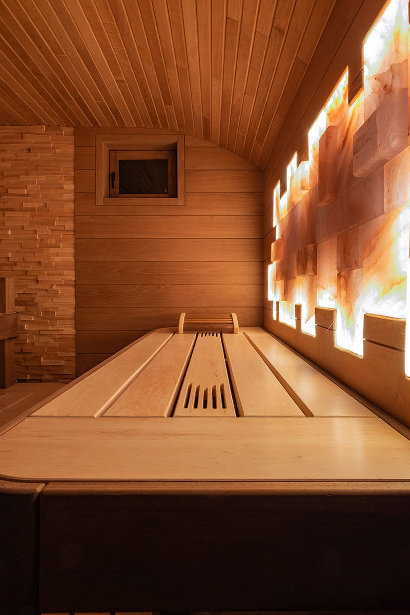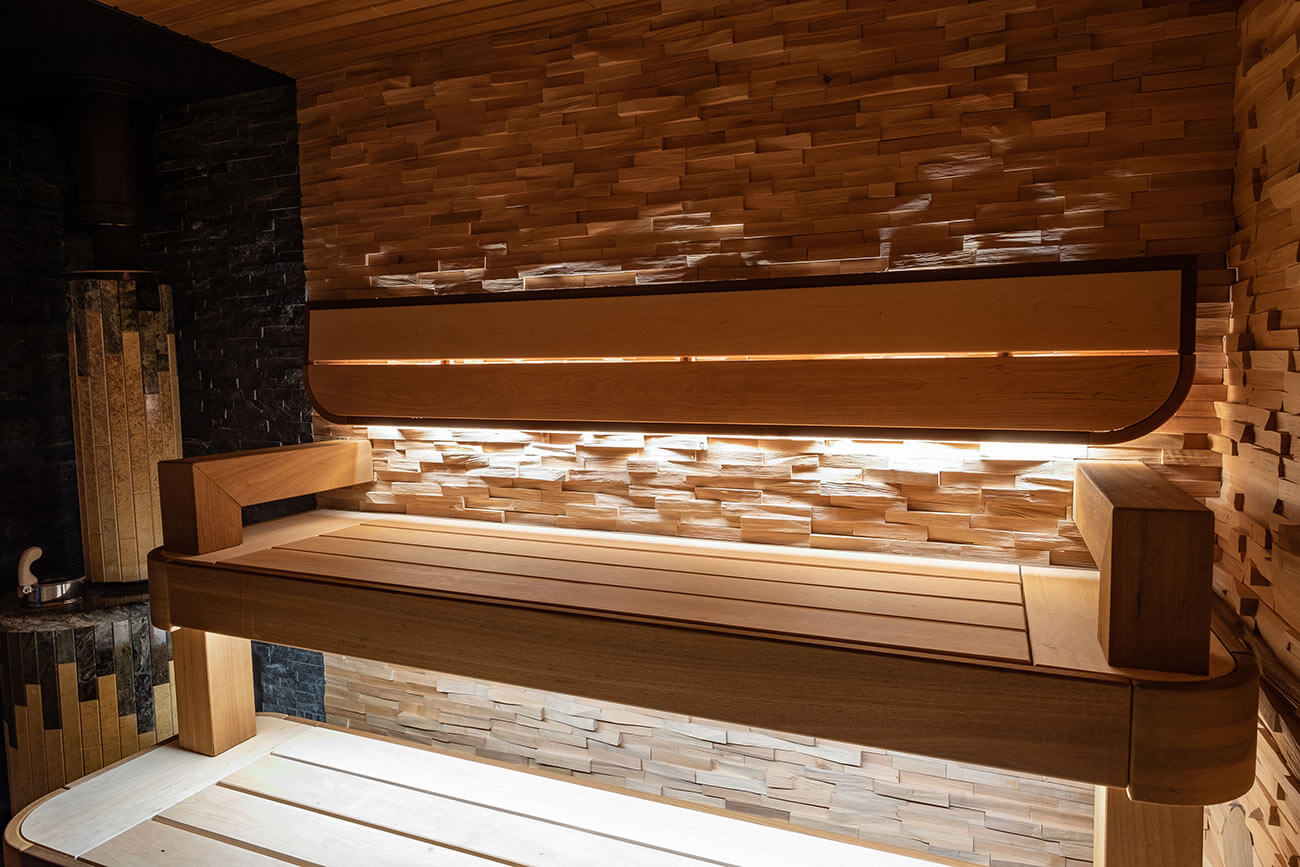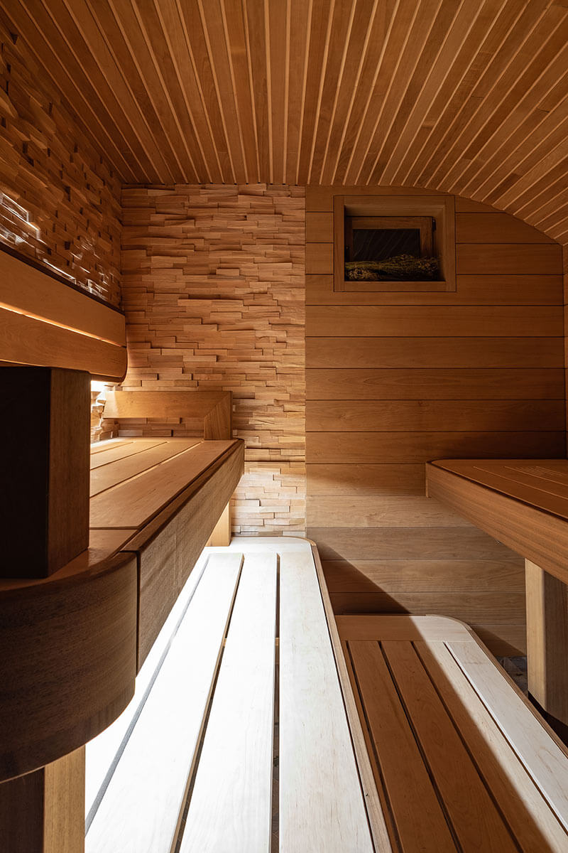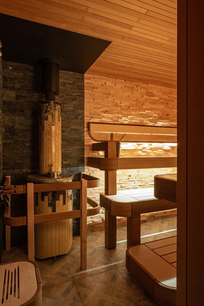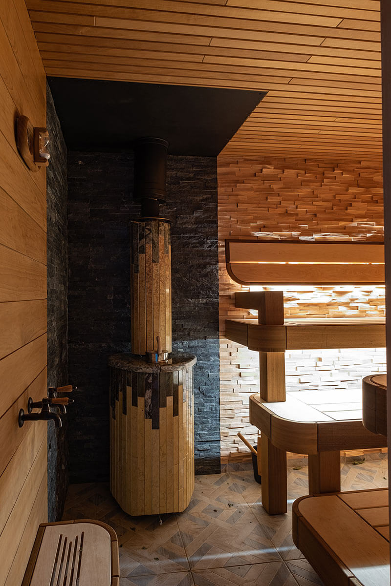 Парная создана для одной семьи. Высоты всех полков выставлены индивидуально, под заказчика и членов его семьи. В полок для парения подведен отдельно свежий воздух с улицы. Есть возможность лежать на полке и через специальные отверстия дышать свежим, прохладным воздухом.
