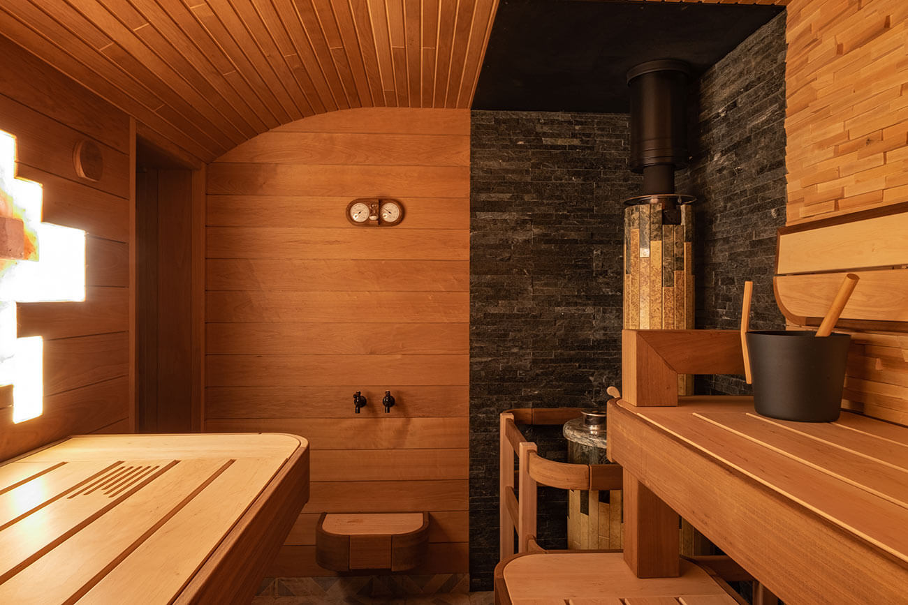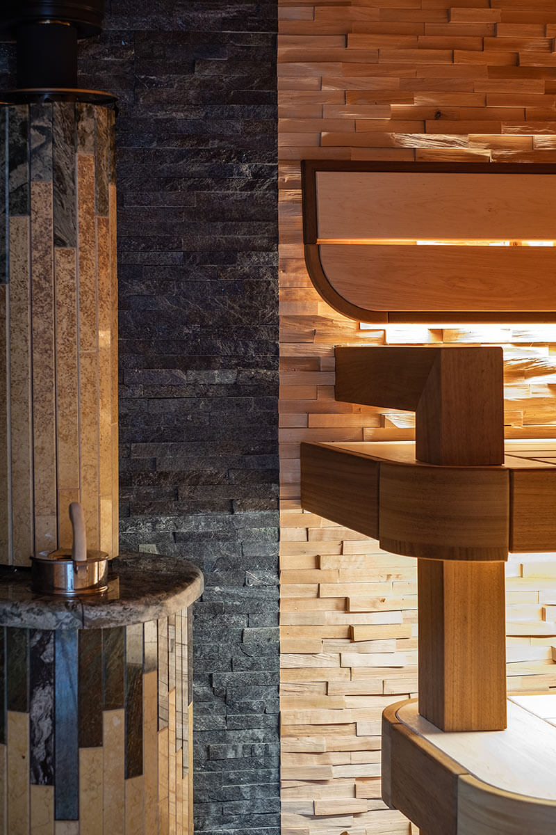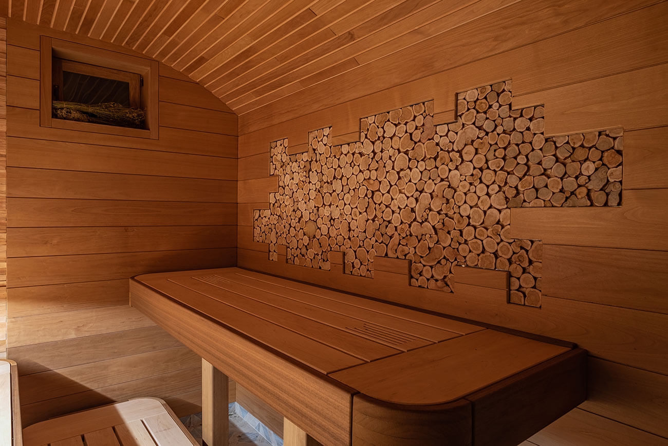 Стена из рваной ольхи. Над полоком для парения потолок закруглен для лучшей циркуляции пара при парении.