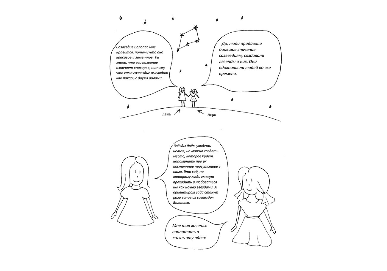 Звезды днем увидеть нельзя, но можно создать место, которое будет напоминать про их постоянное присутствие с нами. Это сад, в котором люди смогут гулять и любоваться им, как ночью звездами. А ориентиром сада станут рога волов из созвездия Волопаса.