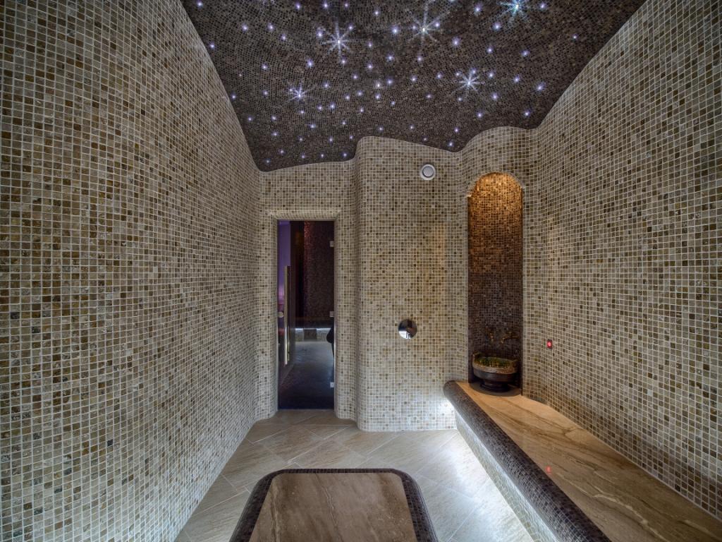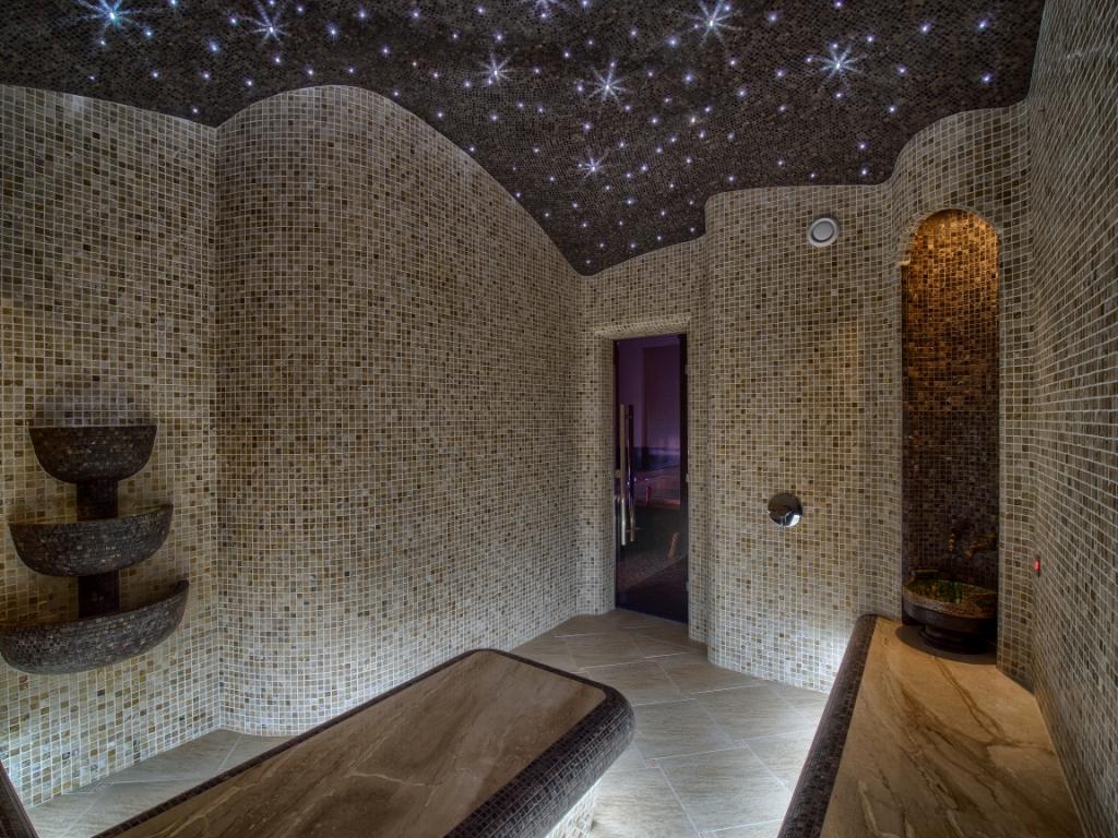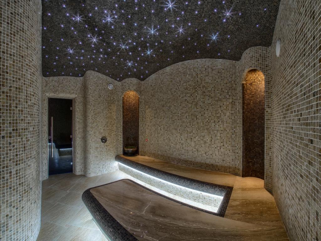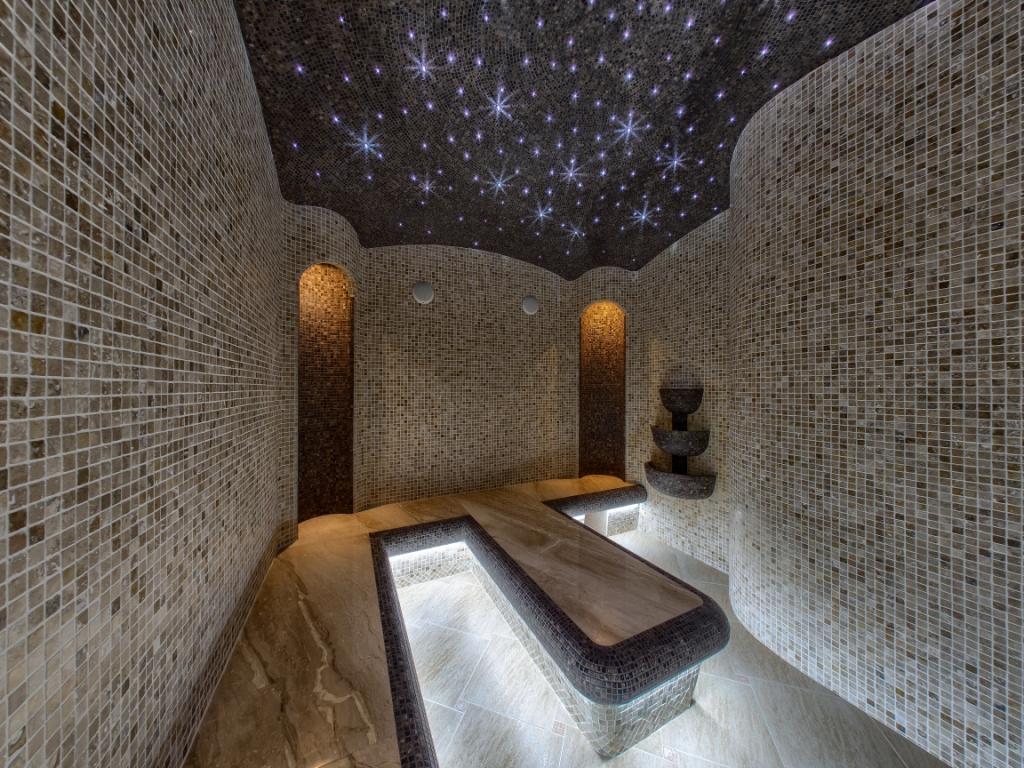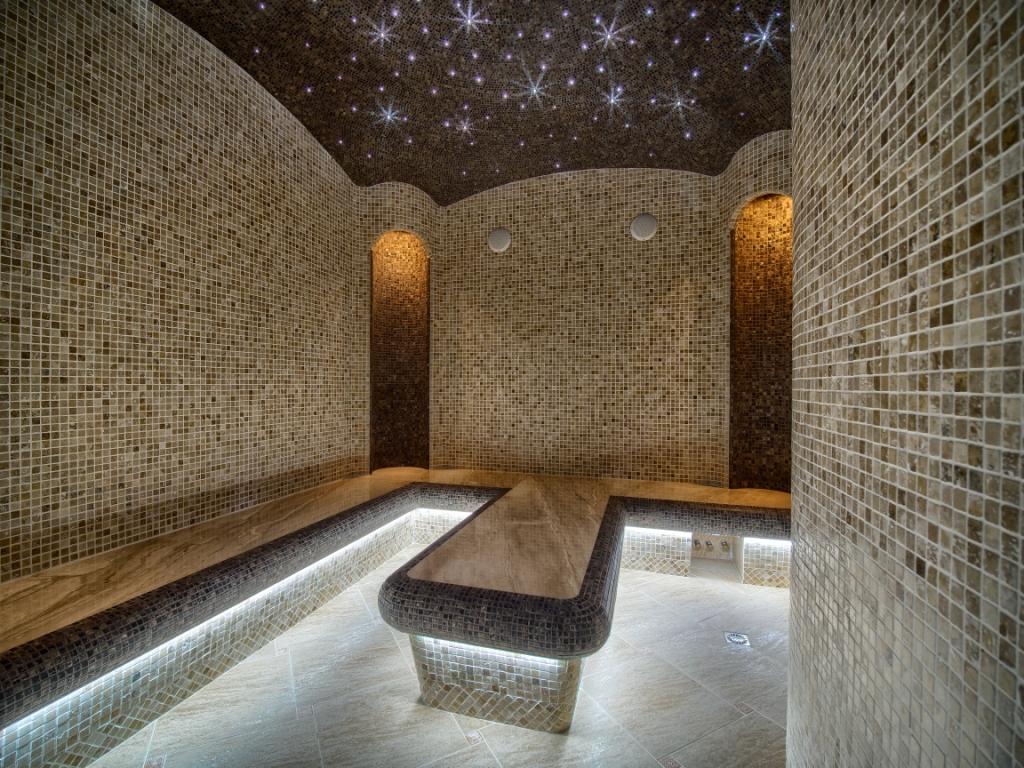 Стены и потолок турецкой бани облицованы наборной мраморной мозаикой, светлые и темные тона создают необходимый контраст. Одним из главных отличительных элементов дизайна хаммама является потолок. Он представляет собой купол — такая форма позволяет влаге, которая собирается на потолке, не капать сверху, а стекать по стенам. Эффект звездного неба считается неотъемлемым атрибутом турецкой бани: для этого используют оптико-волоконные осветительные приборы, дающие неяркий, приглушенный свет. Светодиодная подсветка пола завершает создание уютного полумрака.
