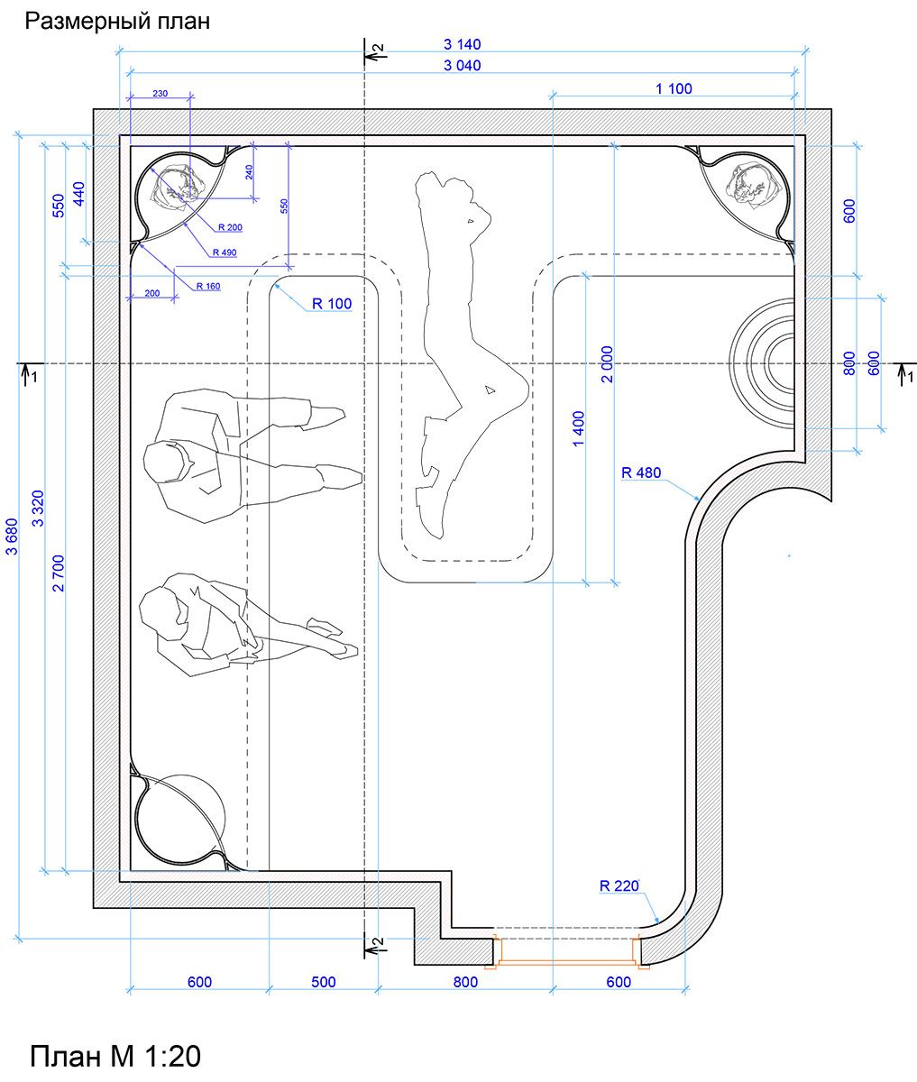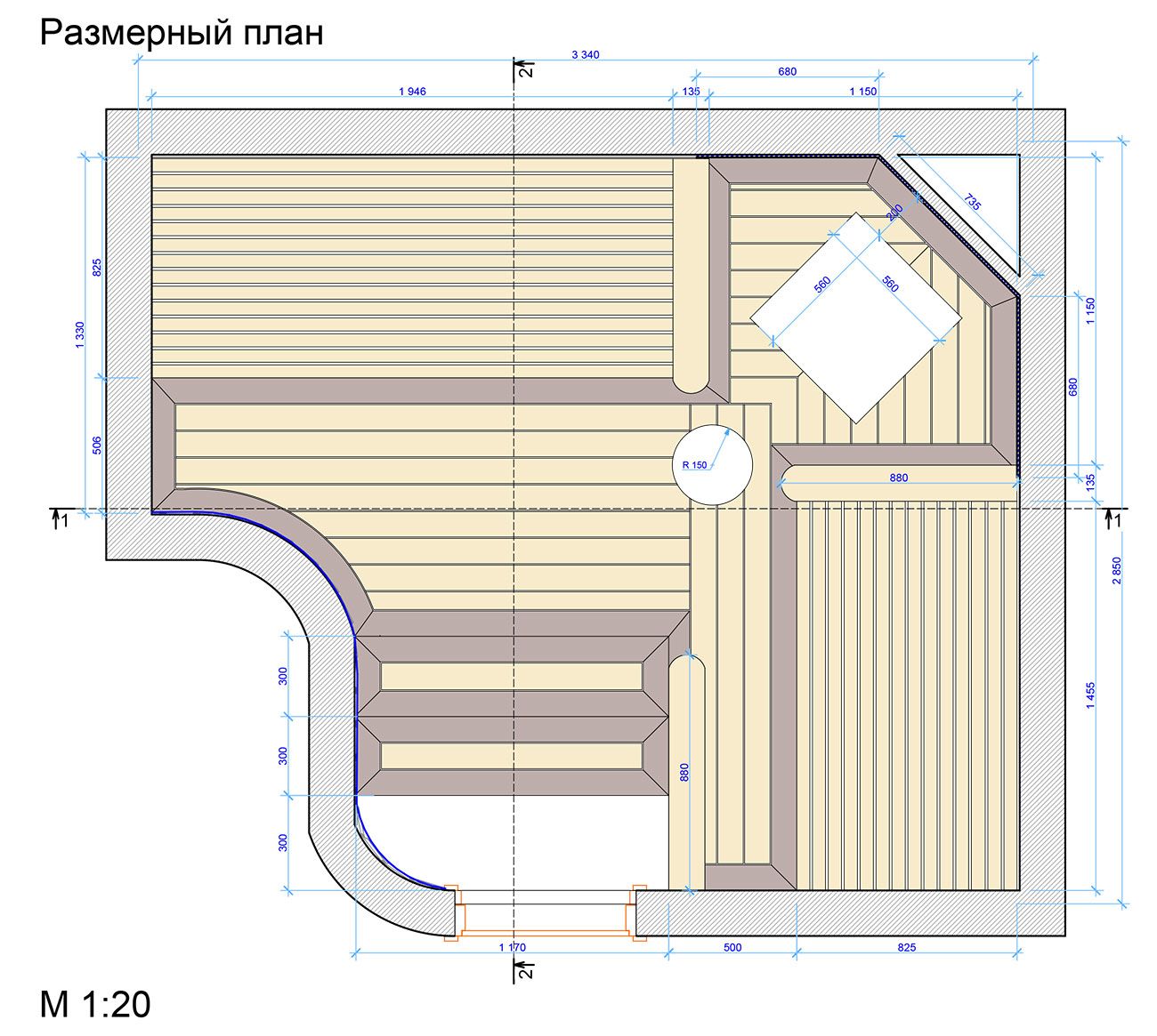 В этой сауне мы решили отойти от привычных полков и заменили их анатомическими лежаками, доска для лежаков использована из африканского абаша, подиум со ступеньками выполнены из комбинированного абаша, светлого и мореного по периметру парной, что придало некий рамочный эффект. Для стен использована вагонка с широким профилем из канадского кедра с горизонтальной зашивкой. Полукруглая стена выполнена из вагонки из липы с вертикальной зашивкой. Потолок изготовлен из вагонки из липы, в центре по задумке заказчика выполнена вставка с расходящимися по сторонам лучами из вагонки из канадского кедра. Вставка придает потолку бесконечность, но в то же время законченность экспозиции.