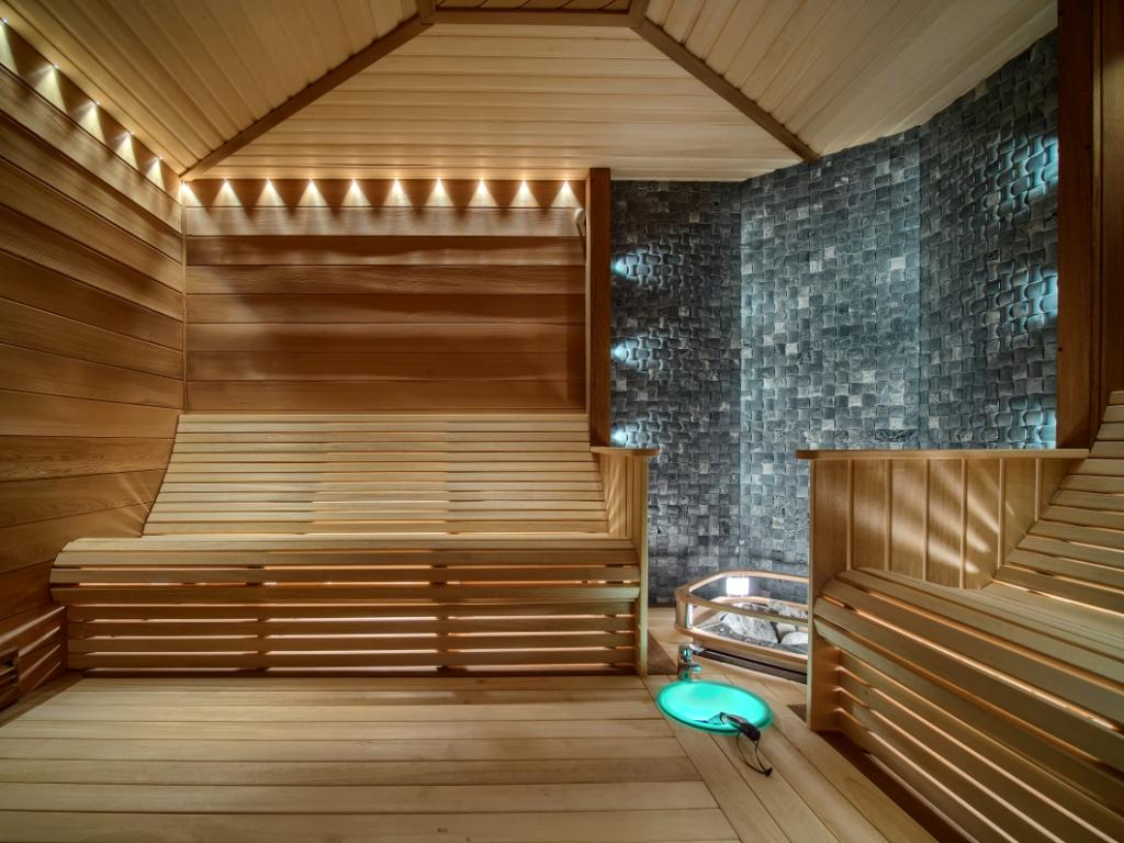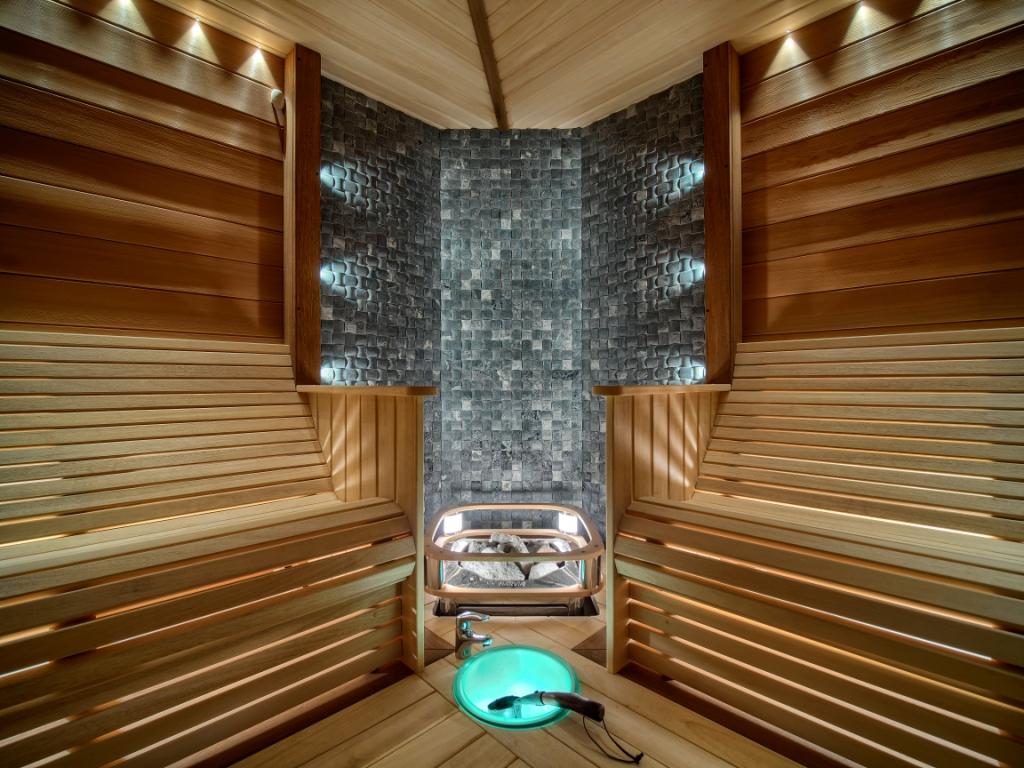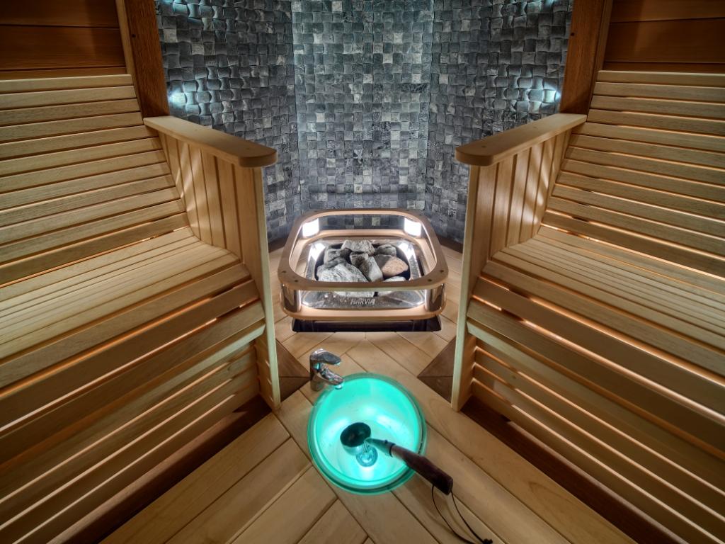 В центре парной находится чаша для воды с подсветкой (Cariitti) и смесителем. Она служит и дополнительным источником света, и арома-лампой, если добавить в нее масла. Спрятанная под подиумом печка (Harvia Elegance) снабжена поручнем со светом, а это еще один сценарий света в парной. Печка окружена стенами, облицованными талькомагнезитом — «огненным камнем», как его называют в Финляндии, натуральным и очень теплоемким материалом, идеально подходящим для саун. Подсветка парной осуществляется оптоволоконными осветительными приборами (Cariitti) по периметру и подсветкой стены из талькомагнезита, что придает некий шарм.