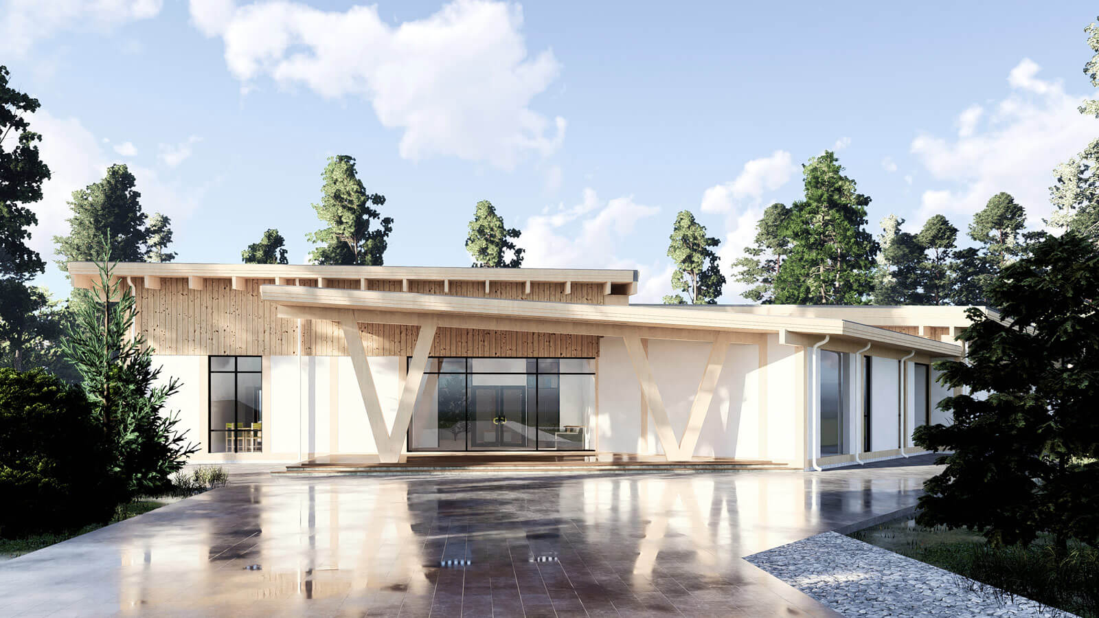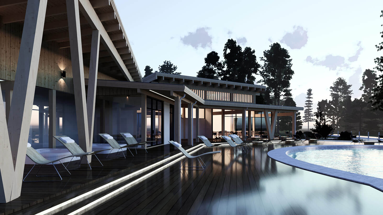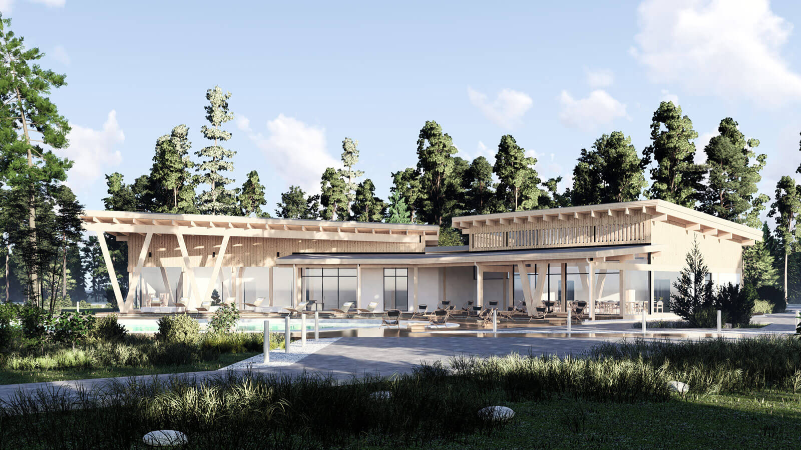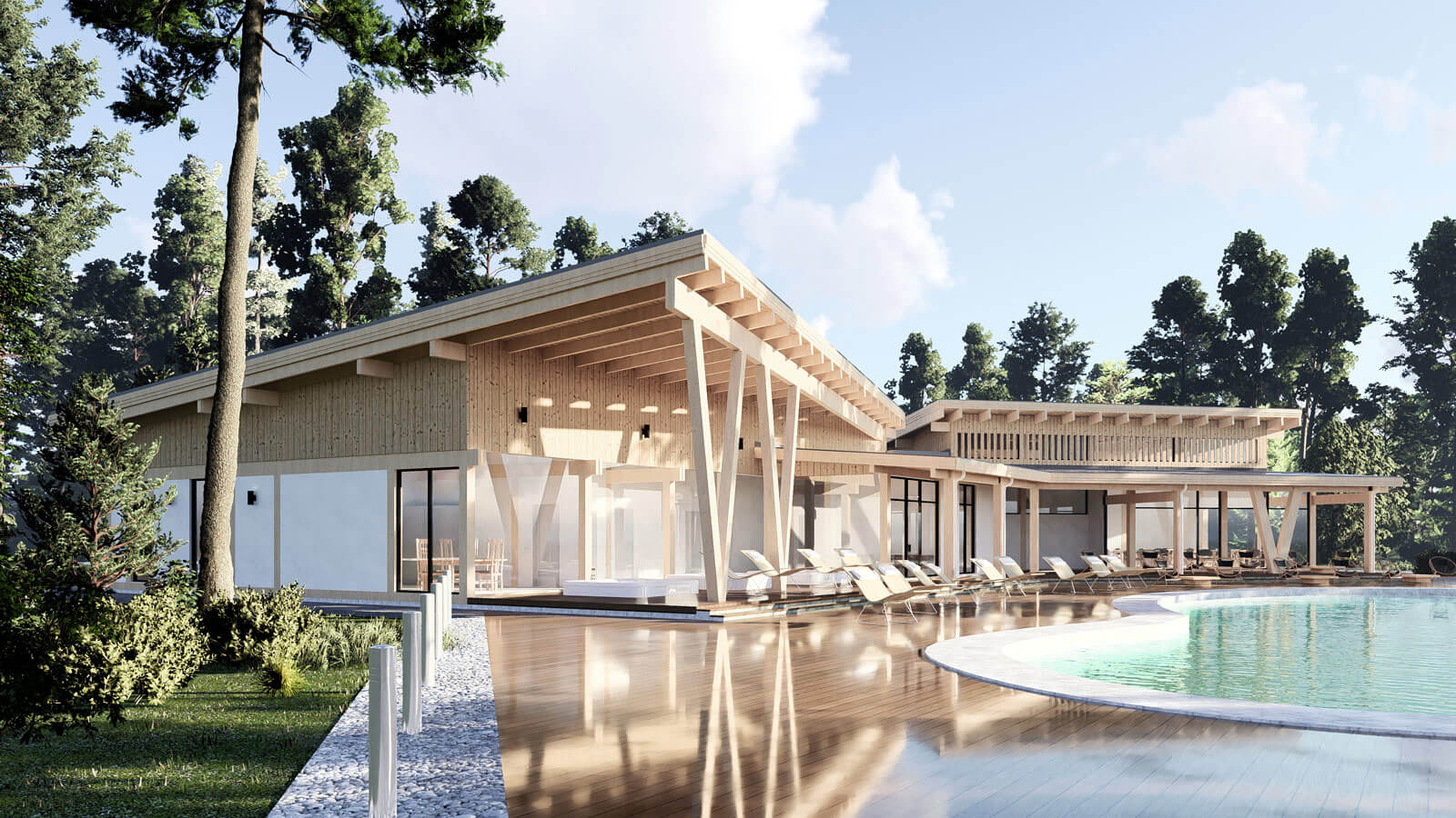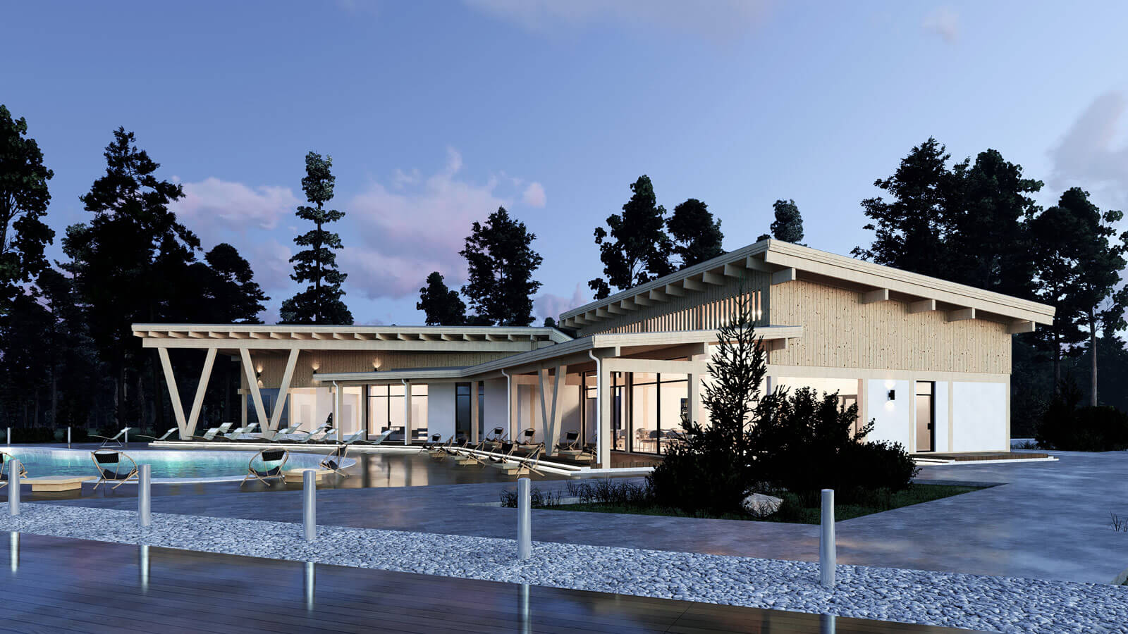 Термин «ан-деор» – круговое вращение от себя в балете. Так и СПА-комплекс разворачивается к своим гостям, раскрывая пластику и изящество линий. Здание выполнено в технологии «фахверк» из клееного бруса. Оно состоит из трех объемов – входная зона по центру, зона кафе слева от входа и блок СПА справа от входа.