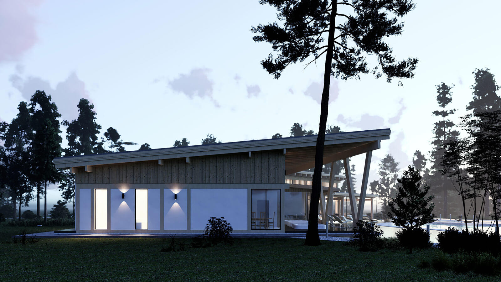 Фасад решен в натуральных и светлых оттенках, т.к. здание расположено в природной зоне эко-отеля. Визуально фасад можно разделить на 2 части – верхнюю глухую, обшитую натуральным деревом, и нижнюю – стеклянную, что создает парящий эффект. Кроме эстетики этот прием имеет функциональное назначение – он позволяет использовать пространство над помещениями для инженерного оборудования и прокладки коммуникаций.