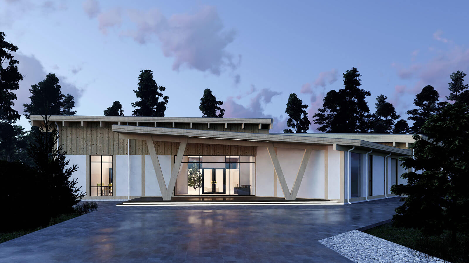 V-образные подпорные конструкции на террасе удерживают большой вылет кровли, который имеет отклонение от параллели фасада и добавляет динамики главному виду комплекса. Декоративные «прорези» в зоне второго света вестибюля создают дополнительное освещение и игру света в интерьере.
