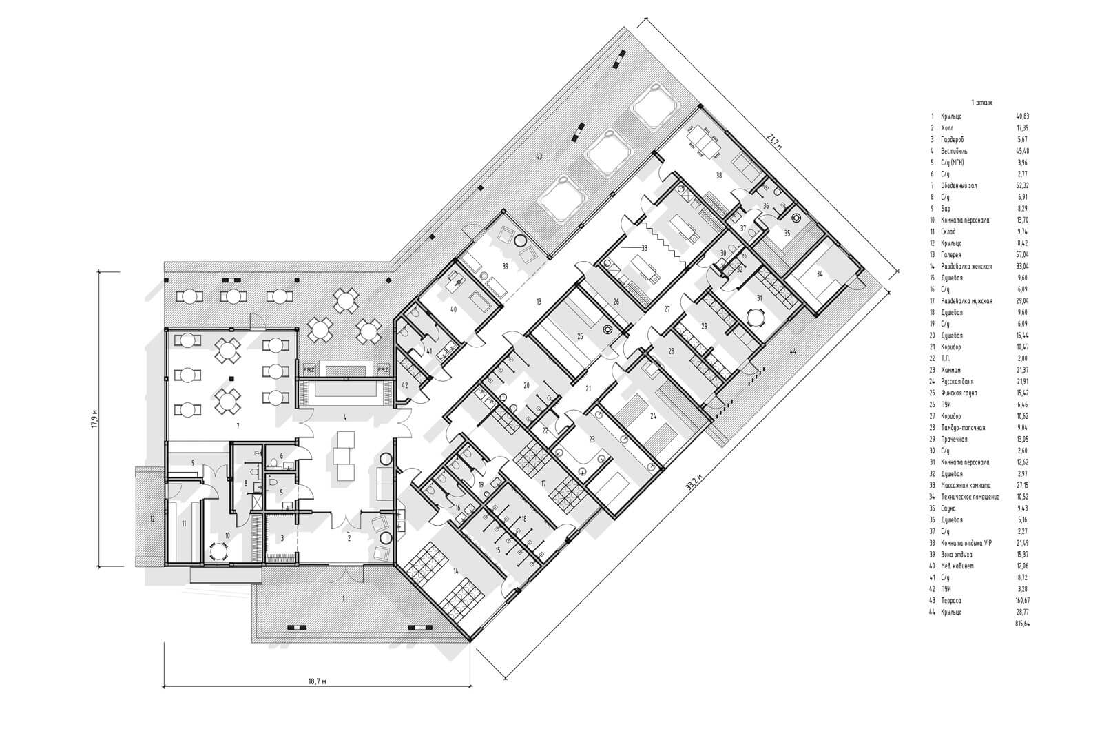 Безрамное остекление галереи СПА-блока соединяет пространство банного комплекса с зоной отдыха у бассейна. Особое внимание в планировочном решении уделено нормативным требованиям к количеству душевых, площади раздевалок и путей перемещения персонала и гостей. Комплекс включает в себя 3 вида бань – Финская сауна, Турецкий хаммам и Русскую баню на дровах с лавками для парения. Большая массажная комната на 2 кушетки – зона расслабления после горячих процедур. В данном комплексе есть отдельная комната отдыха с собственной сауной, которую может арендовать компания или семья.