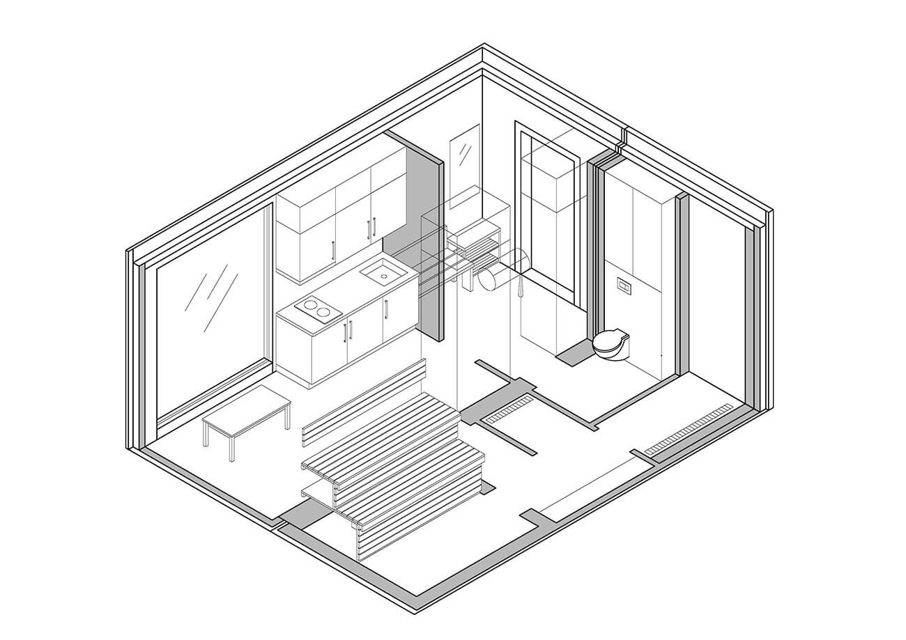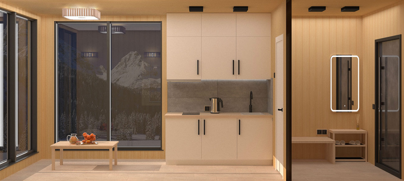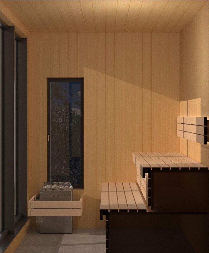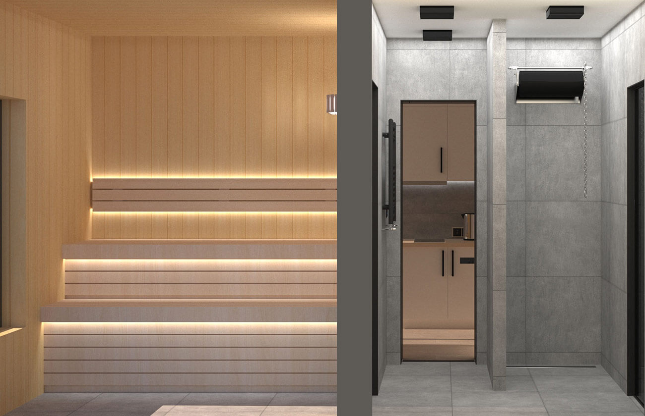 СПА-комплекс оснащён прихожей, санузлом, комнатой отдыха, предбанником, душевой комнатой и парной. Прихожая оборудована встроенным шкафом для верхней одежды, обувницей и скамьёй. В санузле − унитаз, раковина, встроенный шкаф с бойлером и скрытой инсталляцией для унитаза. Комната отдыха включает в себя встроенный шкаф для банных принадлежностей, небольшую кухонную зону, и диван с журнальным столиком. В предбаннике размещены дополнительная встроенная система хранения с открытыми и закрытыми полками, обливное устройство Grill'D Колобок. Из предбанника можно попасть в душевую комнату с врезной полкой в стене и в зону парной с двухуровневыми полками.
