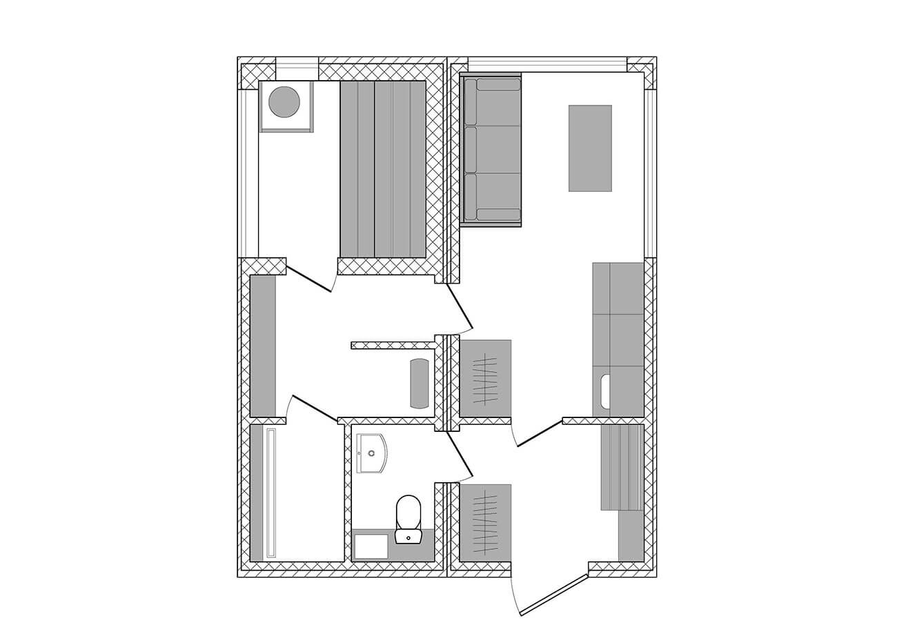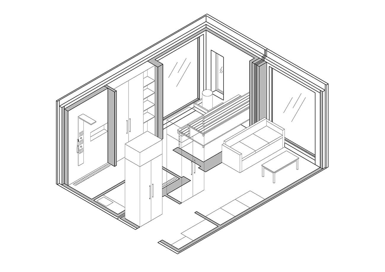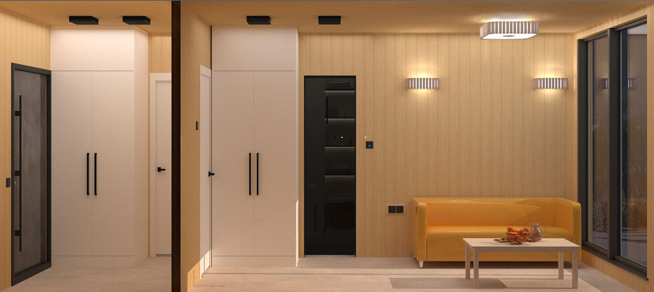 СПА-комплекс оснащён прихожей, санузлом, комнатой отдыха, предбанником, душевой комнатой и парной. Прихожая оборудована встроенным шкафом для верхней одежды, обувницей и скамьёй. В санузле − унитаз, раковина, встроенный шкаф с бойлером и скрытой инсталляцией для унитаза. Комната отдыха включает в себя встроенный шкаф для банных принадлежностей, небольшую кухонную зону, и диван с журнальным столиком. В предбаннике размещены дополнительная встроенная система хранения с открытыми и закрытыми полками, обливное устройство Grill'D Колобок. Из предбанника можно попасть в душевую комнату с врезной полкой в стене и в зону парной с двухуровневыми полками.