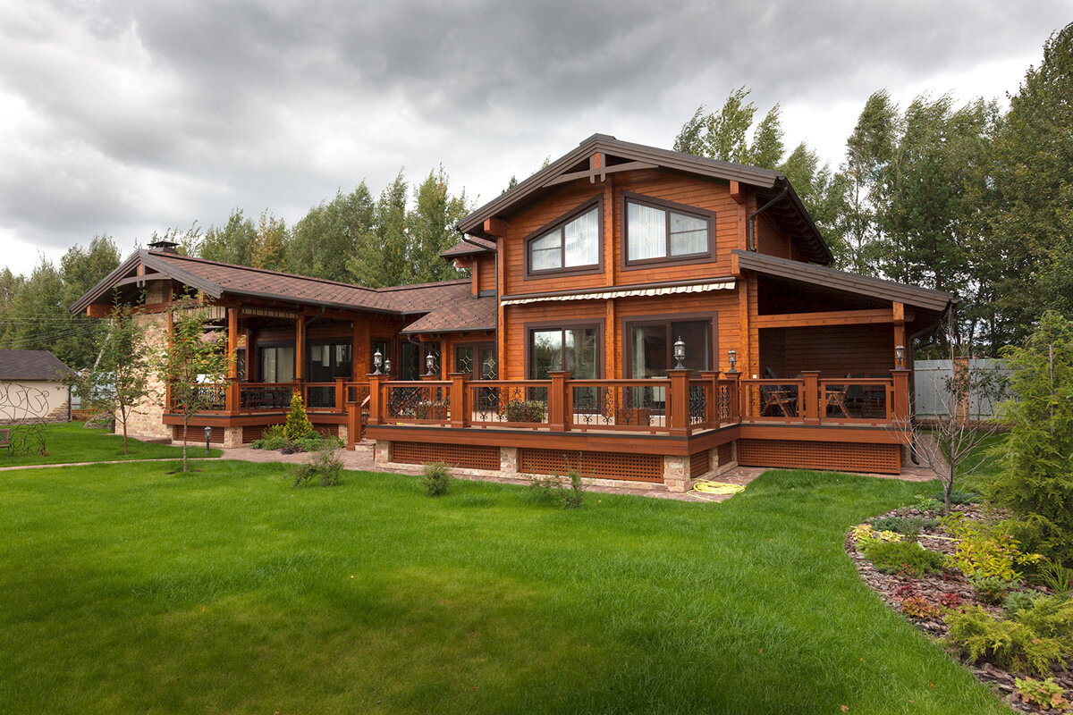 Двухэтажный дом из клееного бруса с жилой частью над зоной отдыха. Конструкция переливного бассейна предполагает подвал, поэтому у дома есть цокольный этаж, в котором расположены системы очистки воды, контроля климата, а также постирочная.