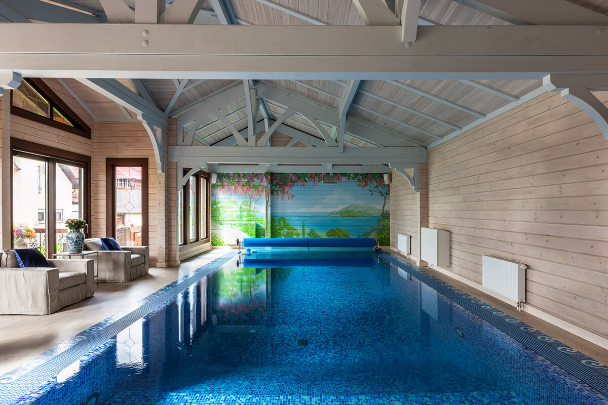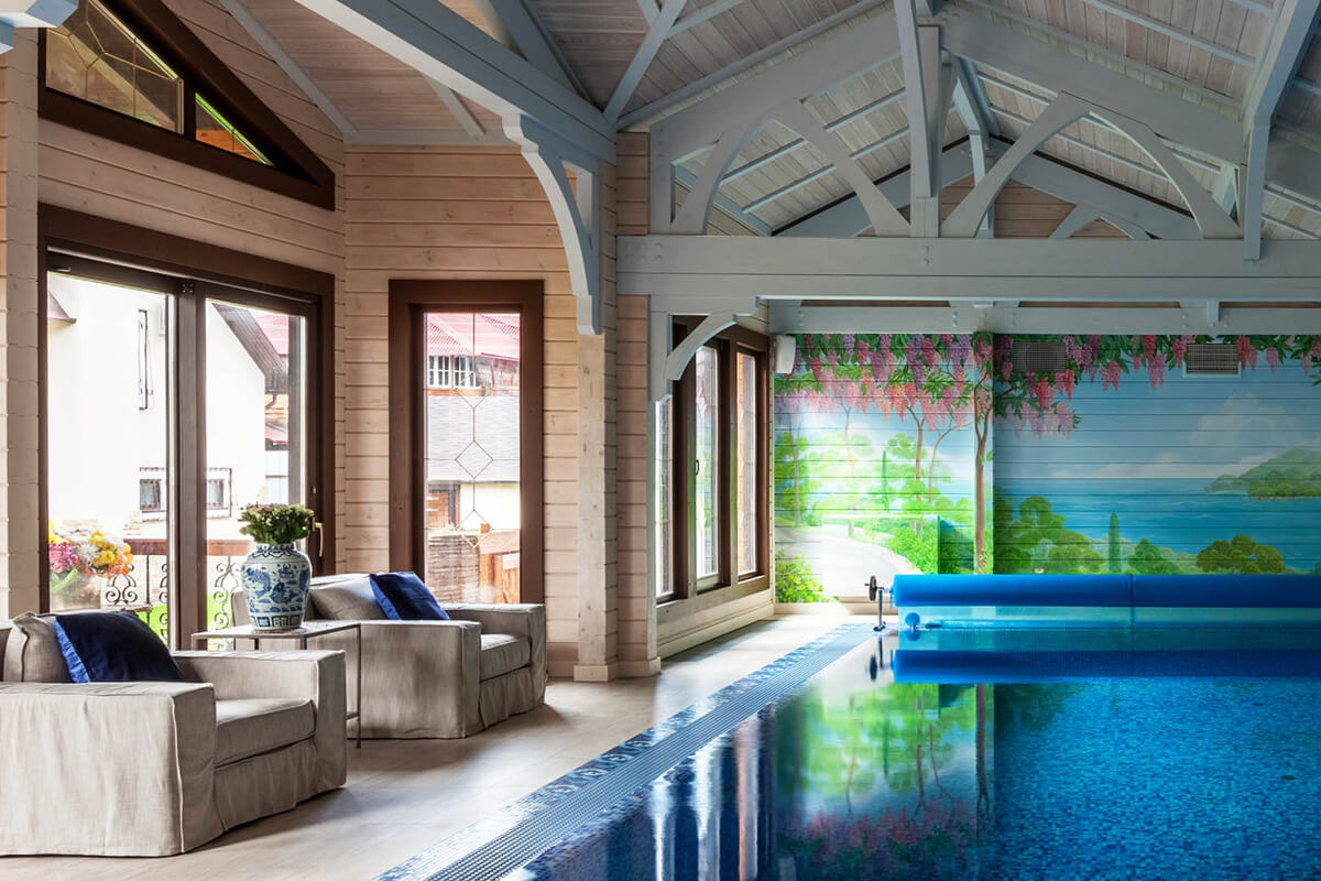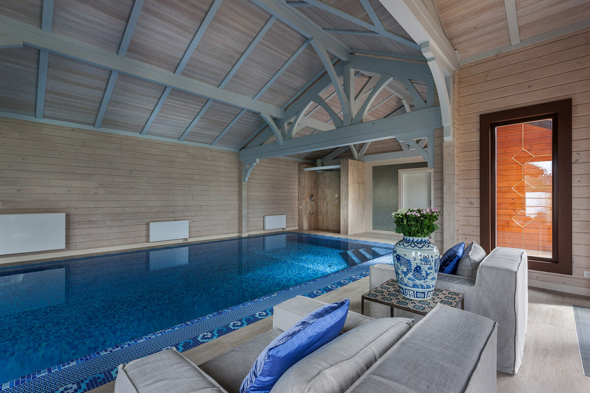 Для этого спа-комплекса обустроен переливной 10-метровый бассейн, где уровень воды расположен на уровне пола. За счет этого и великолепной сине-голубой мозаики чаша бассейна визуально увеличивается. Система приточно-вытяжной вентиляции и осушки воздуха в бассейне отвечают за комфортную температуру и свежесть воздуха.