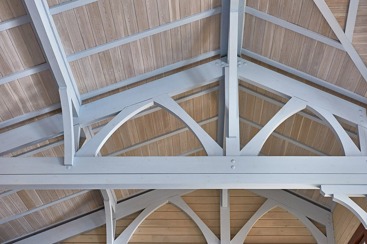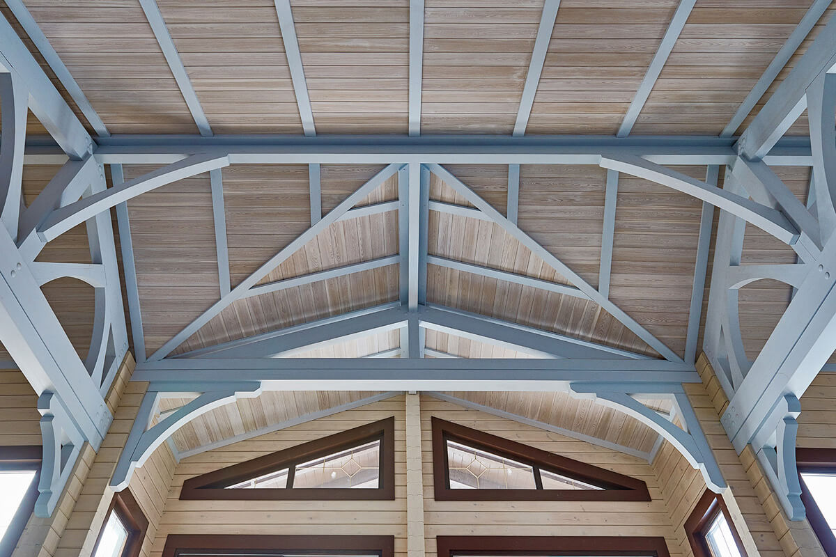 Архитектор продумал систему ферм в зоне бассейна. Для перекрытия больших пролетов крыши использованы фермы, выполненные из клееной стропильной балки большого сечения. Фигурные подкосы на них имеют переменное сечение достаточное для обеспечения несущей способности и также несут эстетическую функцию, поддерживая средиземноморский стиль интерьера, и придают изящность конструкции кровли. Высота потолка в коньке составляет 4,35 м.