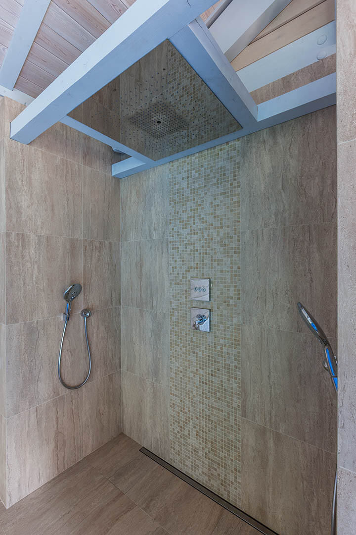 После бассейна возникает потребность ополоснуться проточной водой, для этого в углу обустроен открытый душ. Это так называемый душ впечатлений: холодная и горячая вода подаются дозированно через сложную систему разных форсунок. Полному погружение в атмосферу релакса способствуют варьирование напора воды и температуры.
