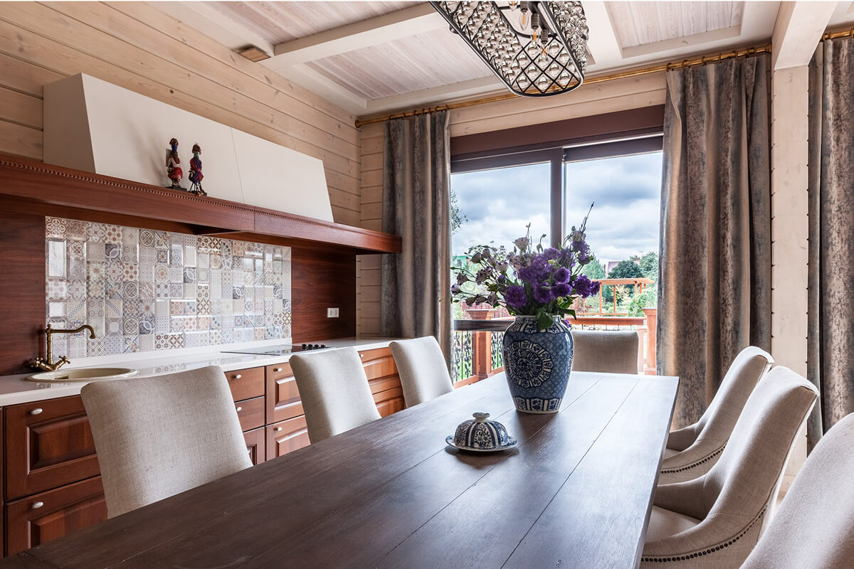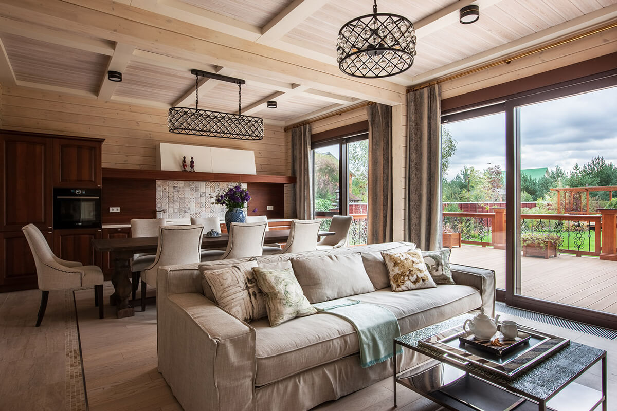 Из гостиной на террасу также ведут окна патио, которые позволяют летом открыть створки полностью и свободно перемещаться из дома на воздух. Для защиты от излишнего солнца здесь установлена выдвижная маркиза.
