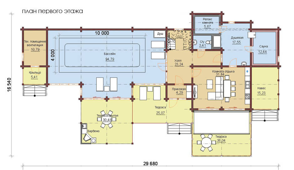 Из бассейна на террасу ведут окна системы патио. Они обеспечивают выход на открытую площадку без ступенек в одном уровне пола. Ввиду нашего северного климата на террасе обустроено несколько зон отдыха: открытая с шезлонгами для солнечных дней и вторая под крышей с печью для барбекю, где можно уютно расположиться в ненастную погоду.
