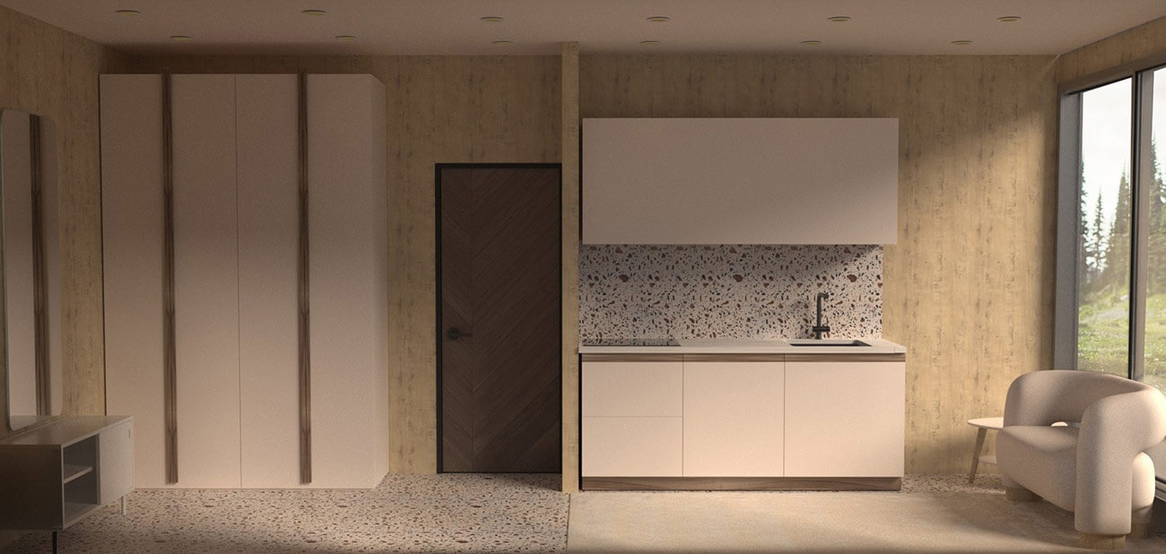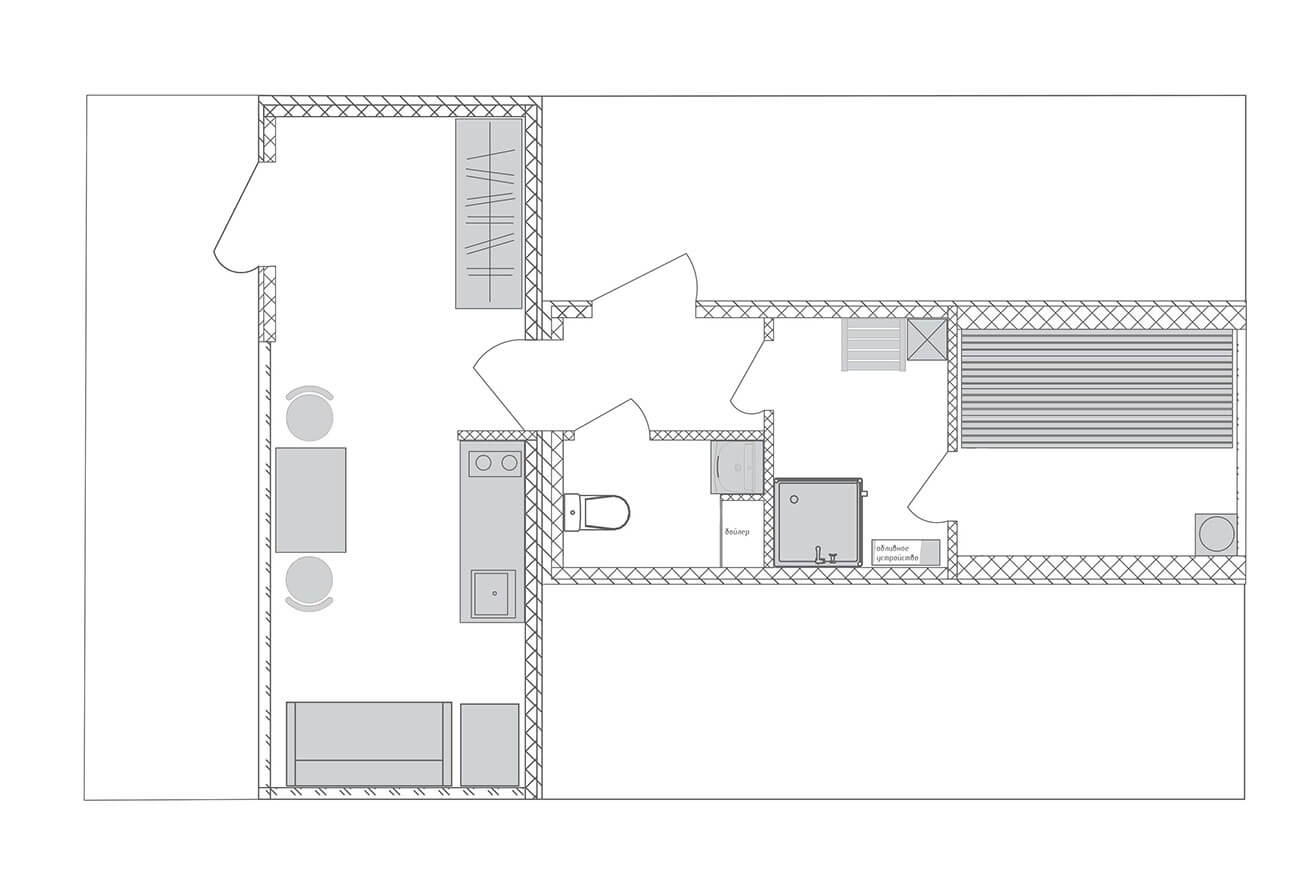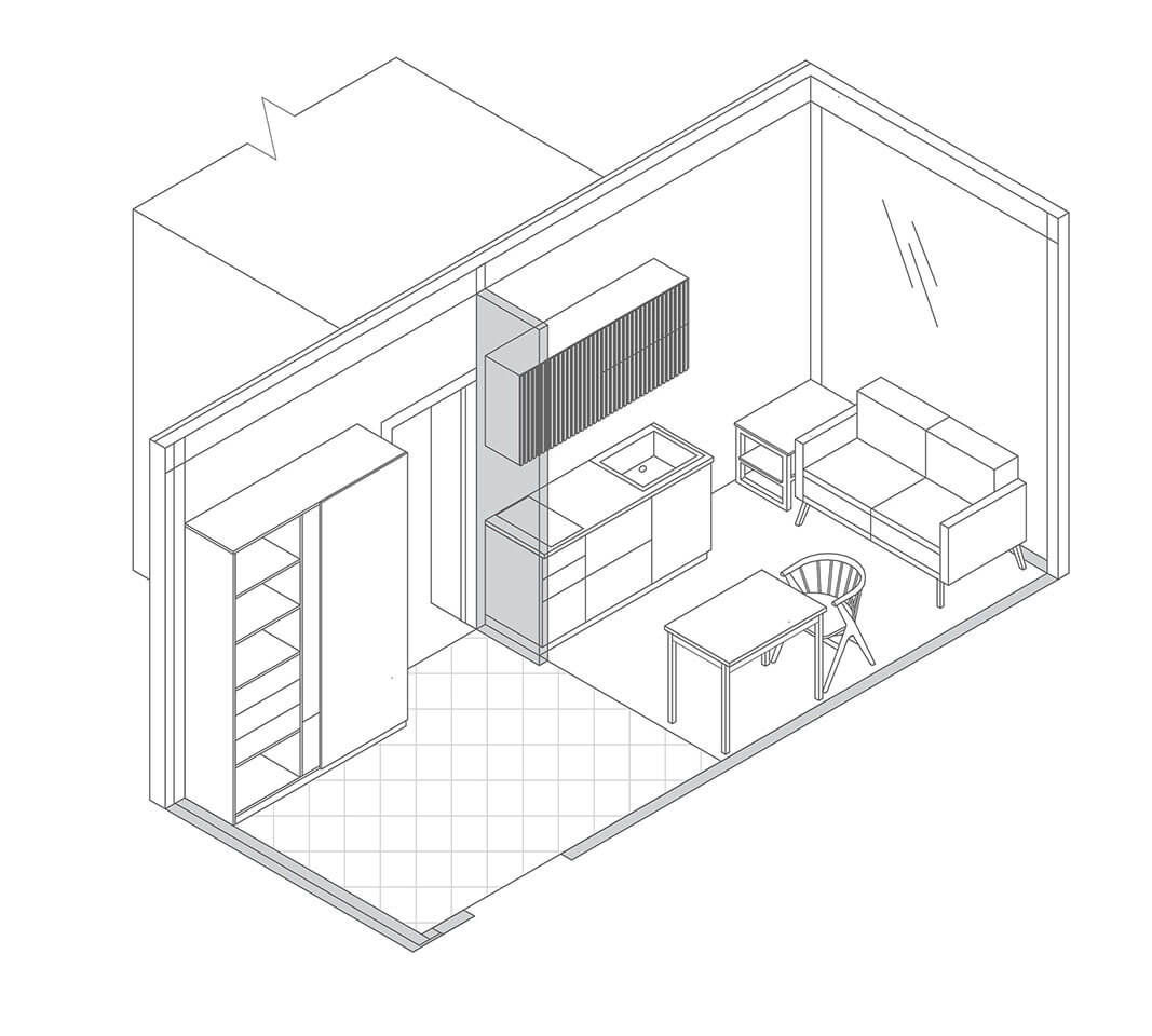 Первый контейнер оборудован местами хранения, место отдыха оснащено небольшой кухней и обеденной зоной.