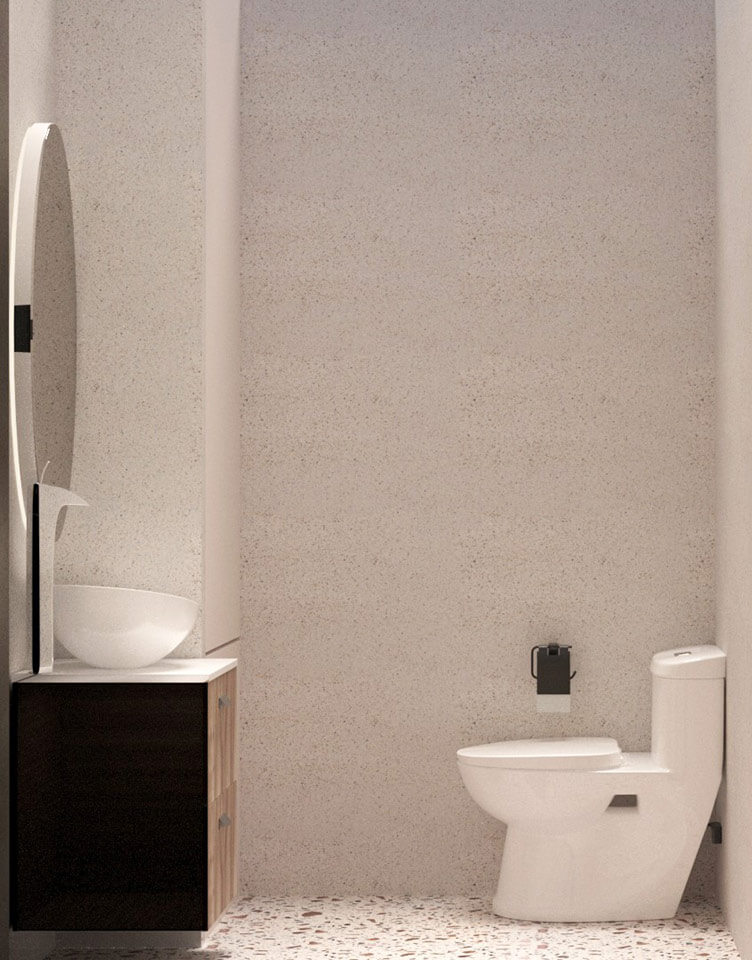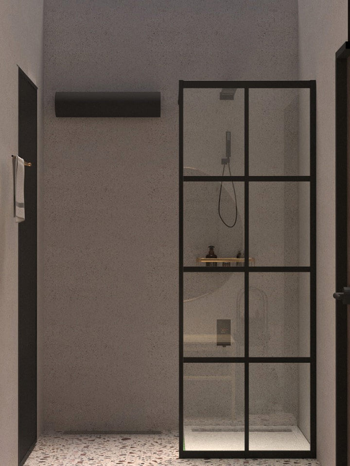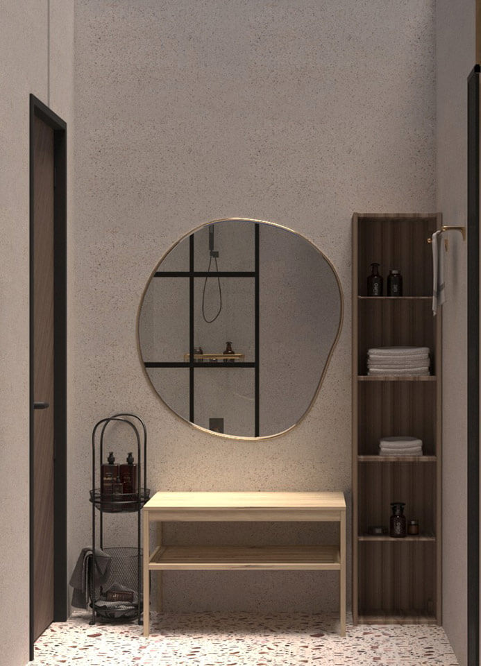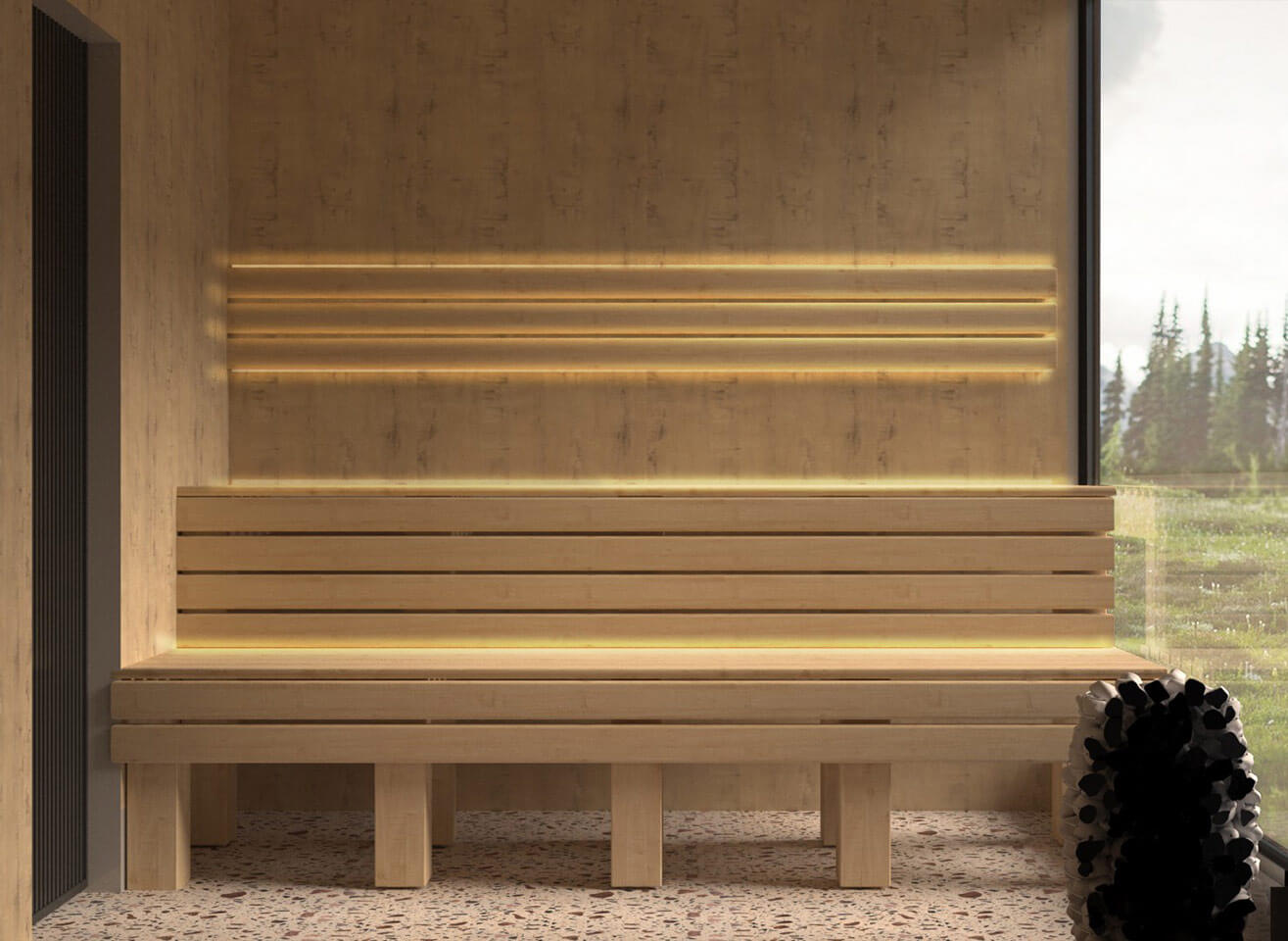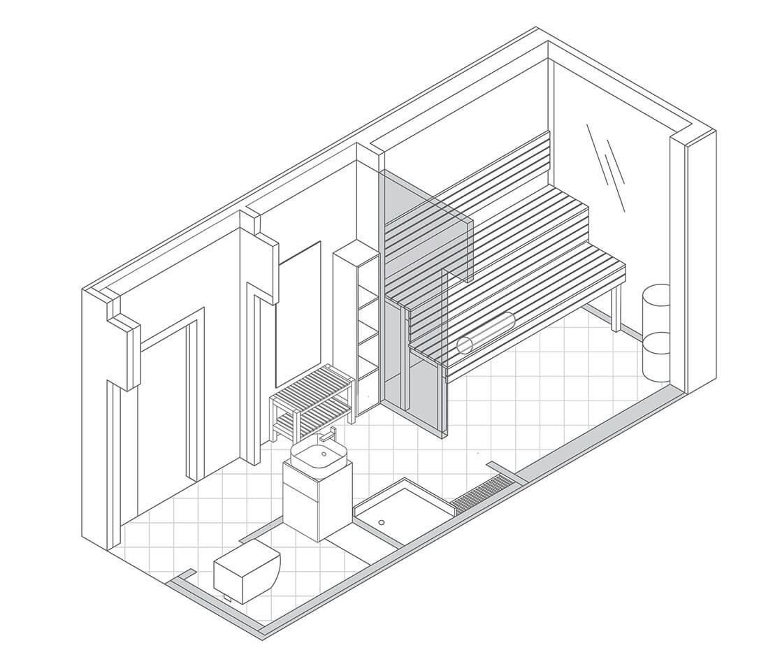 СПА-комплекс оснащен прихожей, комнатой отдыха, санузлом, душевой и парной. В санузле размещен бойлер, спрятанный во встроенный шкаф, в душевой находится обливное устройство. Стены и пол душевой и санузла облицованы широкоформатной плиткой. Помещение первого контейнера и парной облицованы деревянными панелями из липы. Встроенные потолочные светильник используются в качестве источника света. В парной в качестве освещения используются термостойкие ЛЕД-ленты, расположенные за спинкой и в стыках полок. Полки выполнены из канадского кедра.