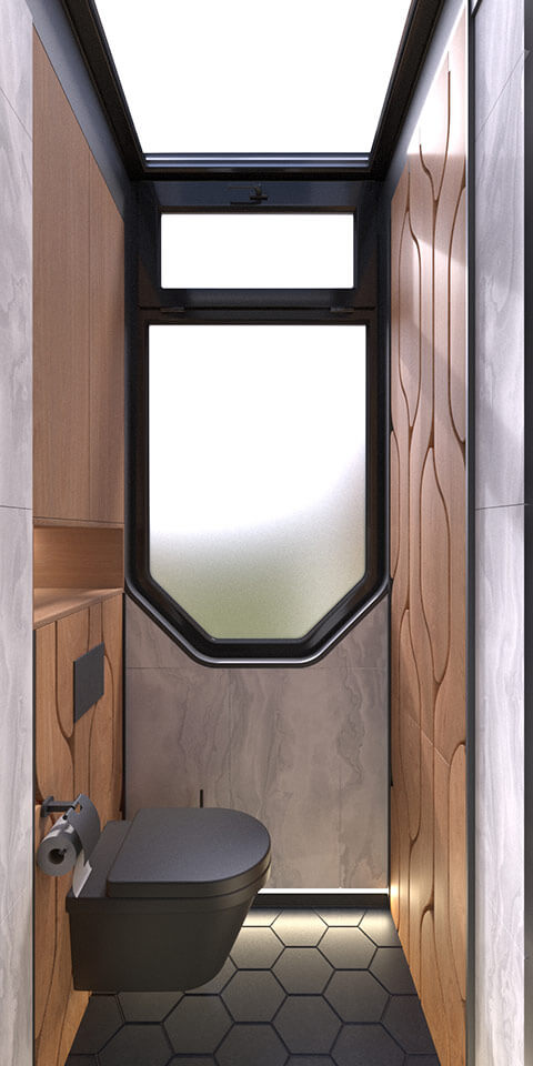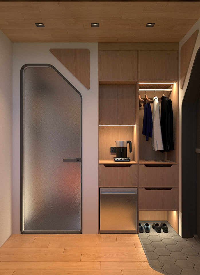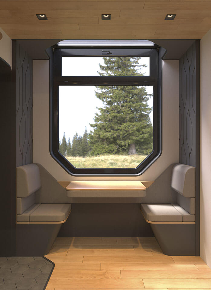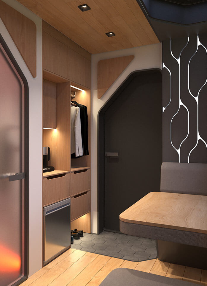 Внутреннее пространство разделено на 4 зоны. Зона отдыха: при входе в зону отдыха справа от двери находится компактный деревянный шкаф для вещей со встроенным холодильником и розетками для электроприборов. У окна расположена полка трансформер, которую при необходимости можно разложить в стол с 2двумя креслами или в спальное место.