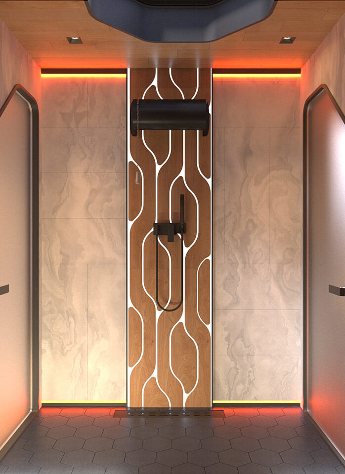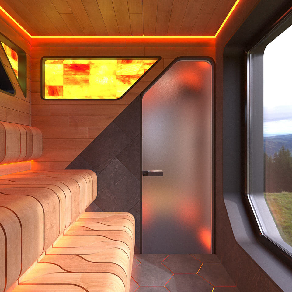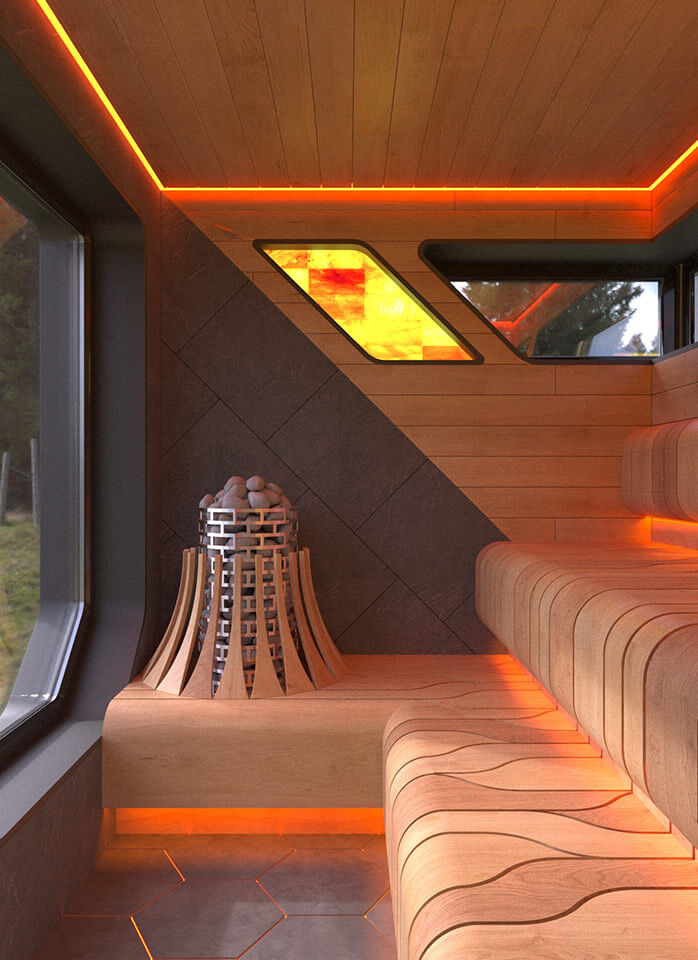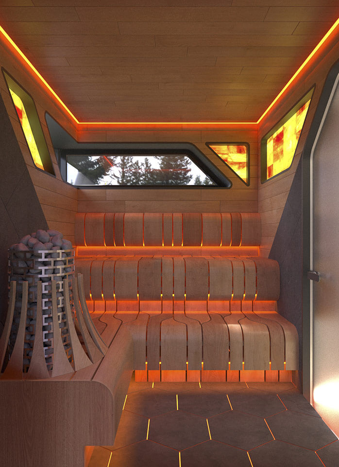 Парная. При разработке проектного решения парной, был использован образно-ассоциативный метод проектирования, образ текучей лавы был выбран как источник вдохновения, поскольку этот природный феномен ассоциируется с теплым и уютным ощущением, что характерно для релаксации в парной. В данной зоне находится двухуровневая дизайнерская скамья, при свечении светодиодной LED подсветки внешне напоминающая потоки лавы. Ограждение для печи выполнено в форме вулкана. При подаче воды на печь образуется пар, который будет напоминать действующий вулкан. Стены украшены подсвеченной гималайской солью, формы которой повторяют формы окна.