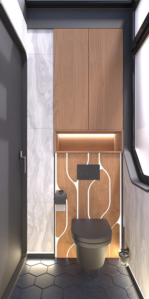 Санузел. В целях экономии пространства в санузле установлена раздвижная дверь. В помещении оборудована инсталляция, над которой находится шкаф для бойлера.