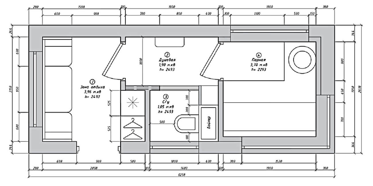 Спа-комплекс изготовлен из морского контейнера 20 футов HC, внутреннее пространство которого теплоизолировано 100 мм пенополистиролом, а также а также оснащено вентиляцией, водоотводом и электричеством для функционального использования.
