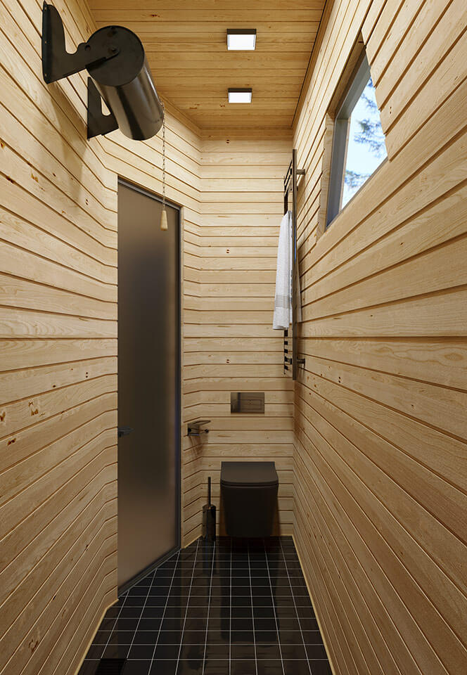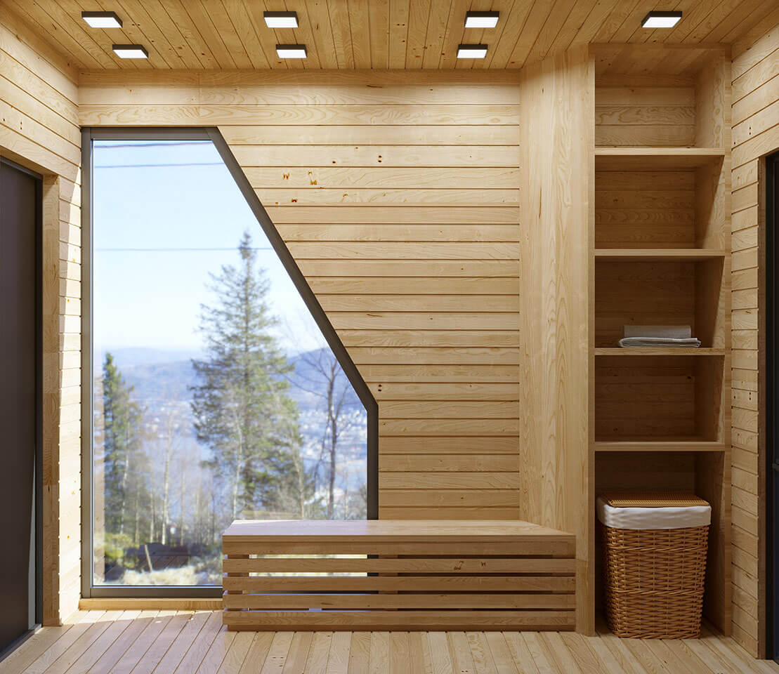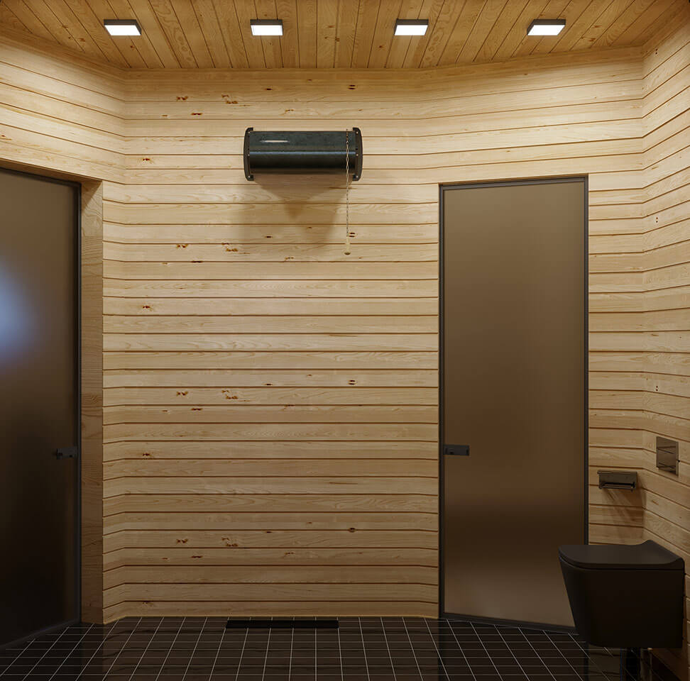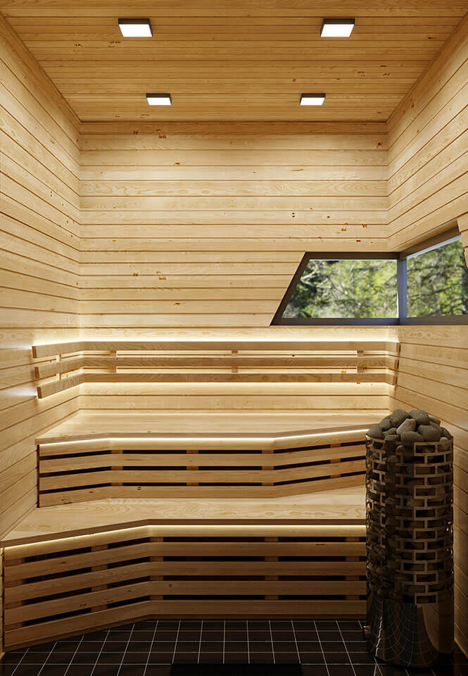 Основным материалом для внутренней отделки сауны послужила ель. Ель славится прекрасной теплоизоляцией и низкой стоимостью. Лёгкий и терпкий еловый запах очень приятен. Он внушает жильцам чувство покоя, избавляет от стрессов, накопившихся за день. Фитонциды, входящие в состав еловой смолы, уничтожают болезнетворные бактерии и избавляют людей от вирусных инфекций. Во всех помещениях в качестве напольного покрытия была подобрана чёрная глянцевая плитка. Двери внутри сауны сделаны из матового закаленного стекла.