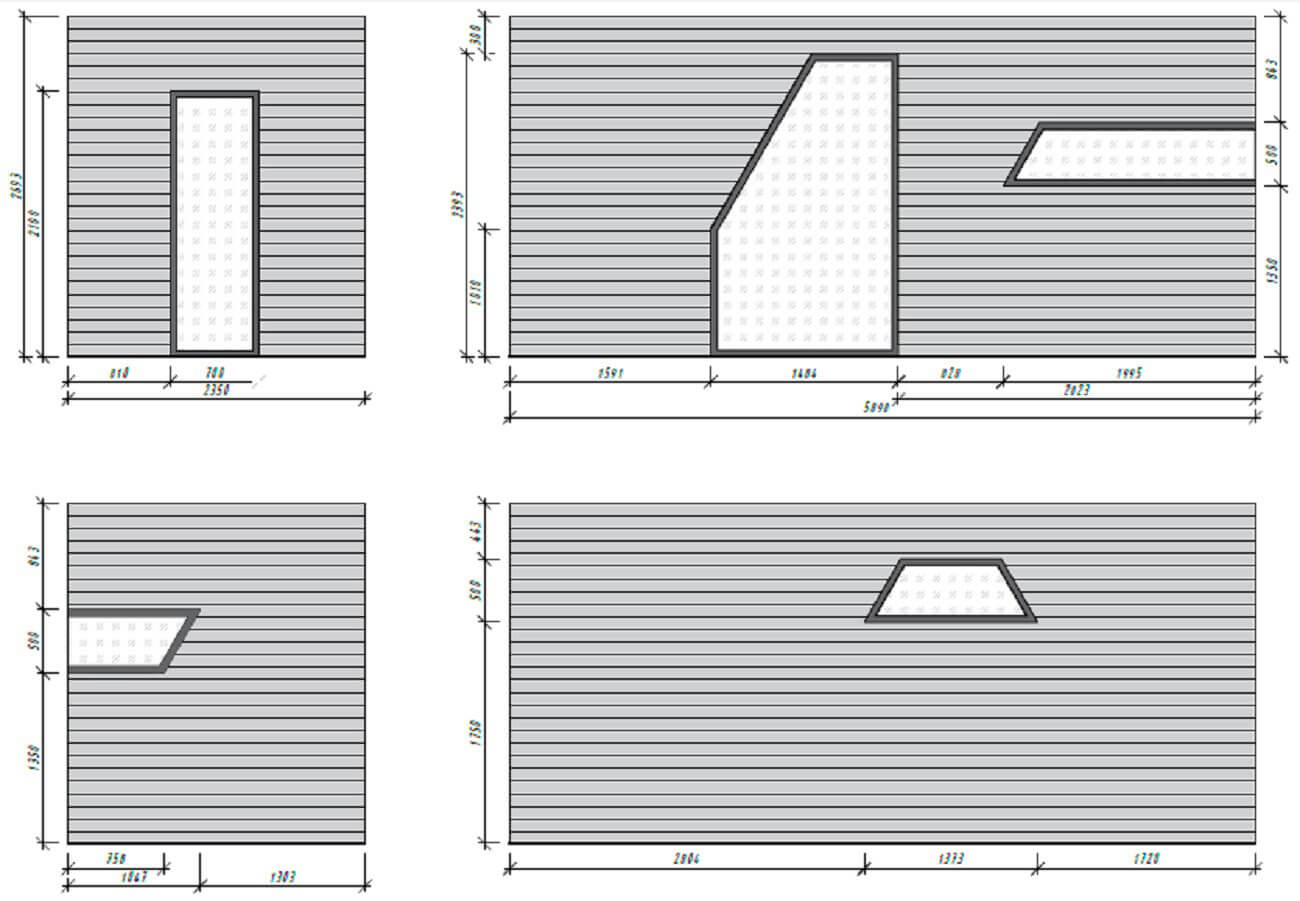 Указаны дверные и оконные проёмы. Двери и окна выполнены из закалённого стекла.