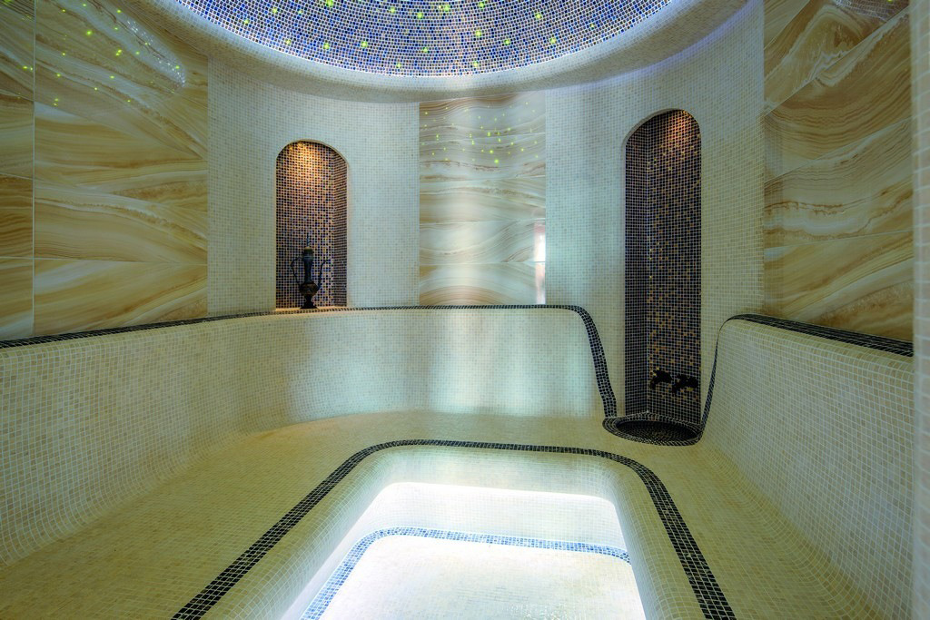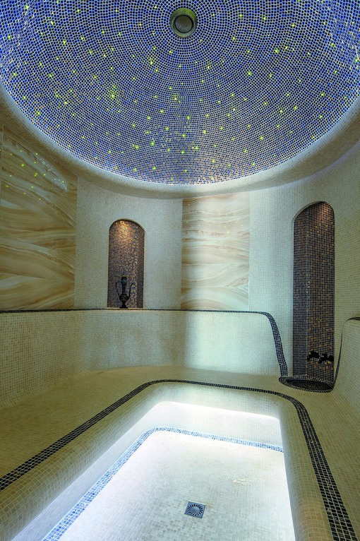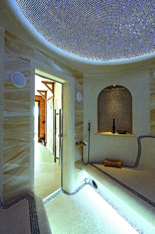 Хаммам выполнен из мраморной мозаики. Купол освещен оптоволоконной подсветкой с эффектом мерцания и LED-подсветкой по кругу купола. В углах расположены ниши с подсветкой, которые можно украшать восточными элементами декора.