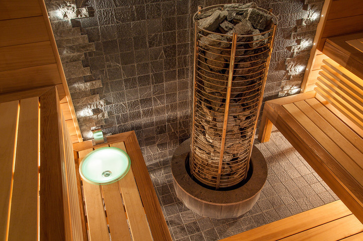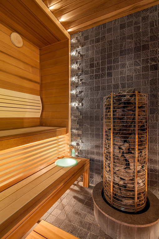 Cтены сауны выложены канадским кедром, лежаки выполнены из абаша. Печь SAWO TOWER интегрирована в отделку из талькомагнезита (комбинация мелкой плитки и колотого камня) индивидуального изготовления. Стена за печью декорирована плиткой из талькомагнезита с оптоволоконной подсветкой Cariitti, что позволяет увидеть структуру камня.