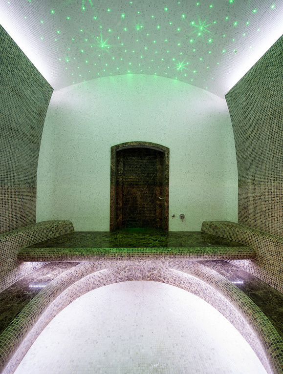 Свод освещен оптоволоконным светом с функцией мерцания. Стены и лежаки дополнены LED-подсветкой. В хаммаме имеется большое количество сценариев света. На пароподаче смонтирована система ароматерапии.