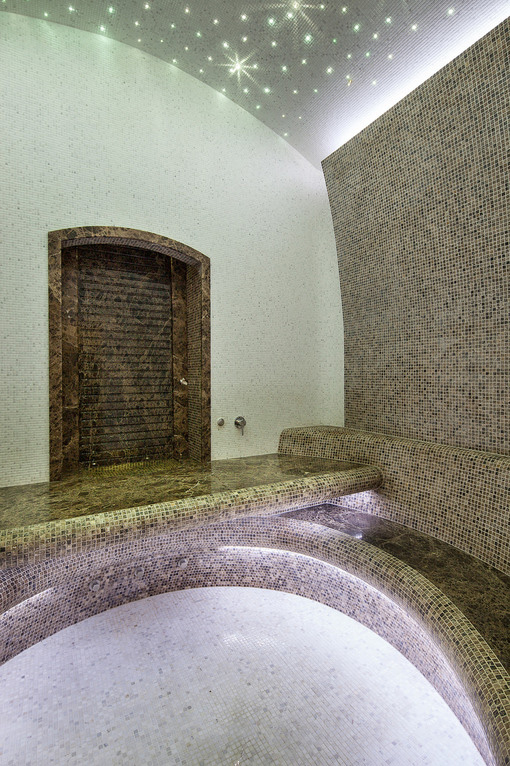Хамам выполнен из мозаики темного и светлого оттенков, плавно переходящей в мраморную поверхность лежаков. Радиусные анатомические сиденья для прогрева расположены по бокам. В центре находится лежак для пенного массажа.