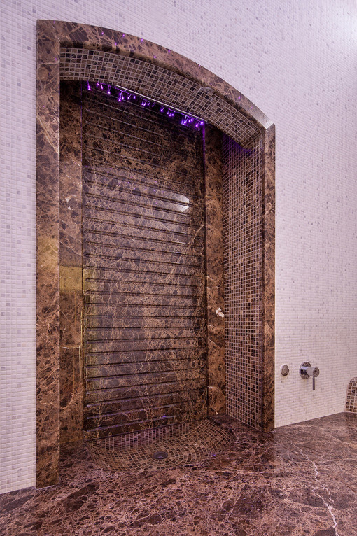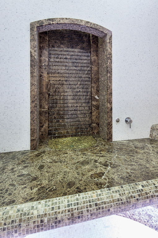 Главный акцент помещения — мраморная ниша с водопадом. Струи воды с оптоволоконной подсветкой, скатываясь вниз, собираются в чаше, которая является частью лежака. Переполняясь, вода из чаши вытекает на лежак для массажа, растекается по всей его длине и переливается на пол, образуя еще один водопад.