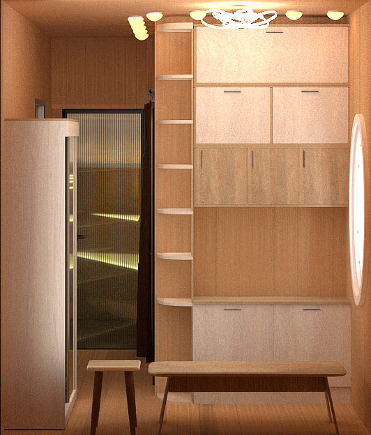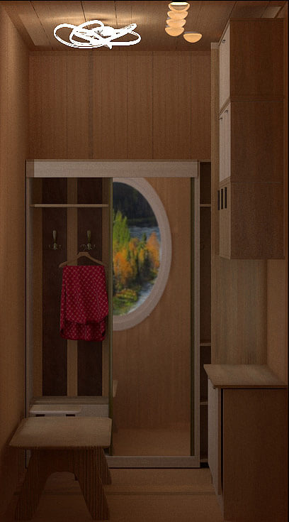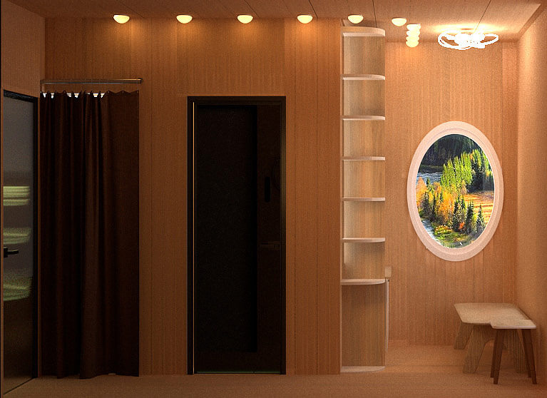 Предбанник оборудован местами для хранения и отдыха. Верхнюю одежду можно расположить в шкафу. Зона отдыха оборудована передвижной скамьёй и табуреткой. В отделке стен использована вагонка из того же материала, что и в парной. Рядом с окном организовано функциональное место для хранения вещей и место для чая.