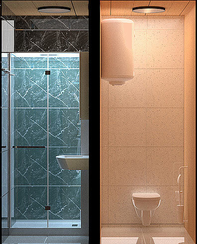 СПА-комплекс оснащён душевой, санузлом, парной, зоной отдыха и гардеробной. В душевой размещены: кабина и раковина. Стены и пол душевой облицованы плиткой. В санузле стены облицованы мраморной плиткой белого цвета. В качестве источника света использованы встроенные потолочные светильники.
