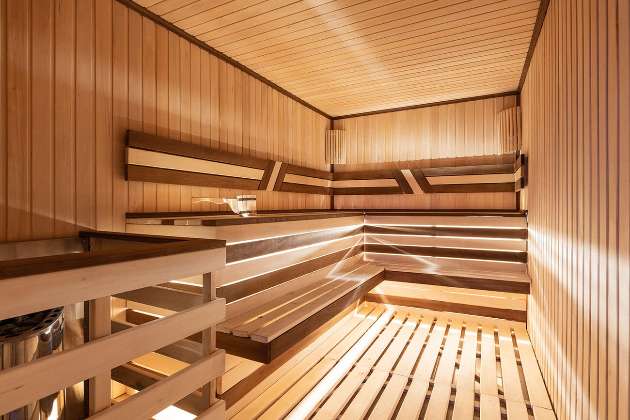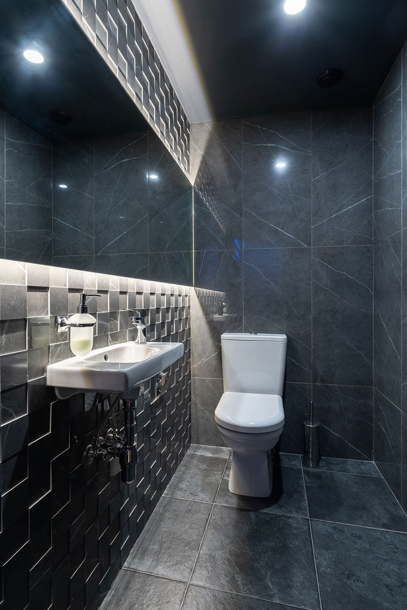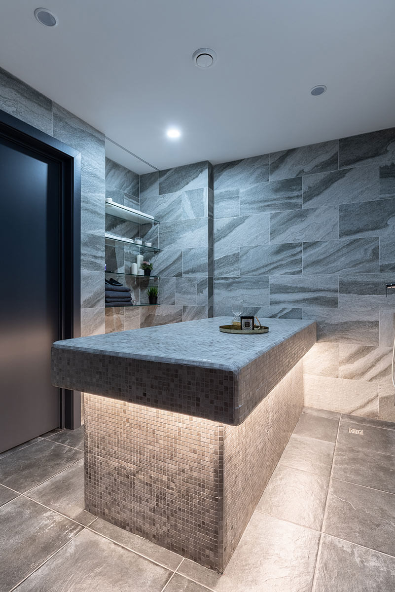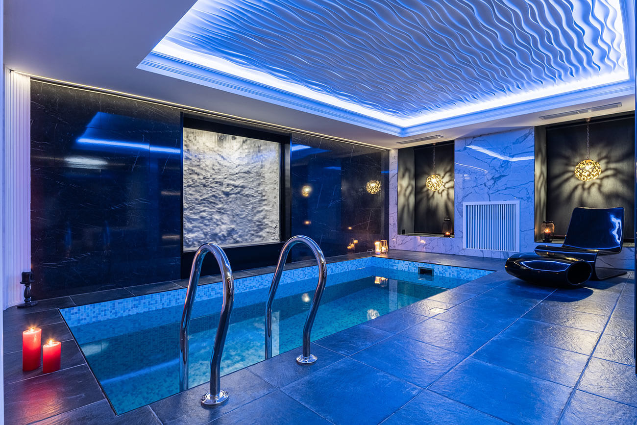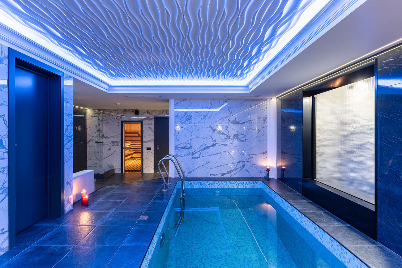 Для создания различной атмосферы зона бассейна имеет сложную систему освещения — здесь и димируемая цветная подсветка фактурного потолка, изменением цвета которого перекрашивается все помещение, подвесной свет в окнах, линии света вдоль стен бассейна и зоны отдыха. Все это позволяют создавать разные световые сценарии в интерьере, от полумрака пещеры до яркого света, акцентирующего ключевые зоны интерьера.