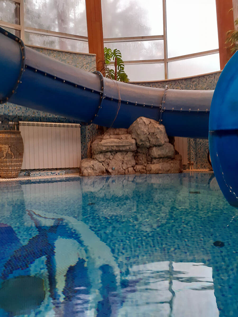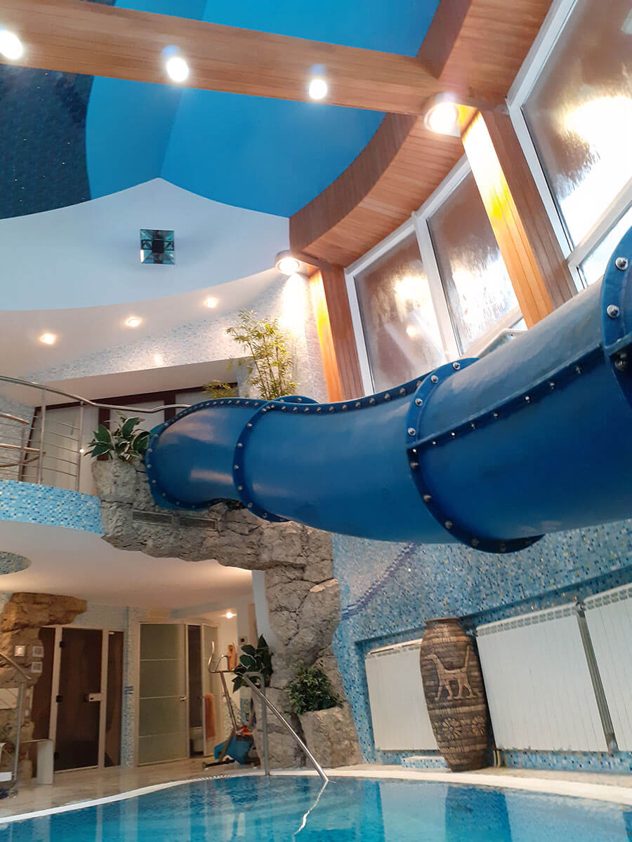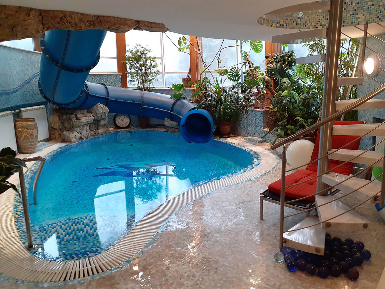 В центре спа-зоны спланировано помещение с плавательным бассейном переливного типа. Его чаша изготовлена из бетона, облицована мозаикой, оснащена системой противотока и оборудованием для подогрева воды (производства компании Pahlen). Рядом установлен удобный лежак (фирмы Alexander Rose). Над купальней смонтирована высокая изогнутая горка-труба, по которой можно скатиться в воду со второго этажа. Наверх ведет металлическая винтовая лестница с каменной отделкой ступеней.