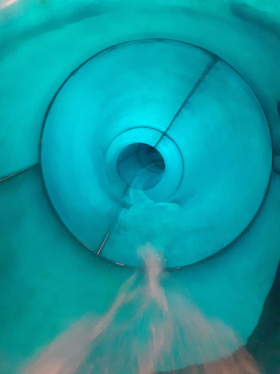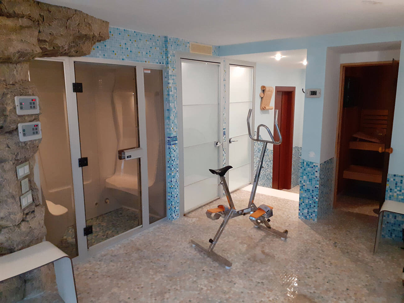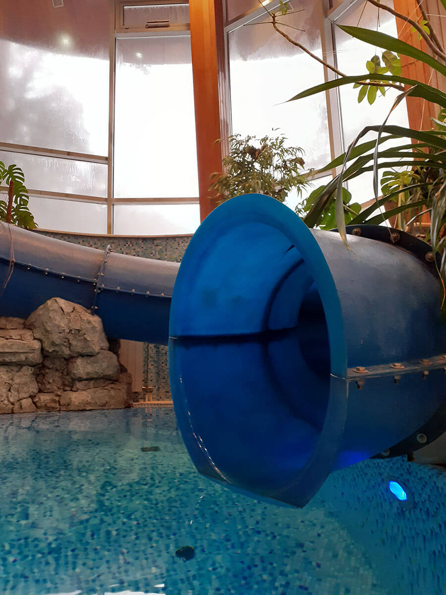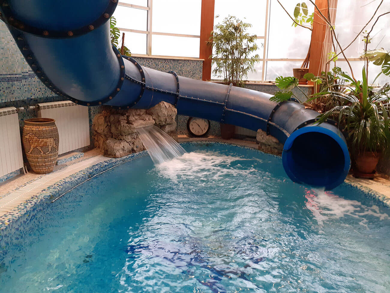 В центре спа-зоны спланировано помещение с плавательным бассейном переливного типа. Его чаша изготовлена из бетона, облицована мозаикой, оснащена системой противотока и оборудованием для подогрева воды (производства компании Pahlen). Рядом установлен удобный лежак (фирмы Alexander Rose). Над купальней смонтирована высокая изогнутая горка-труба, по которой можно скатиться в воду со второго этажа. Наверх ведет металлическая винтовая лестница с каменной отделкой ступеней.