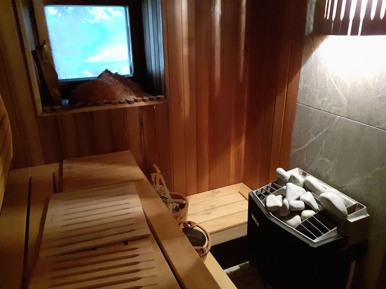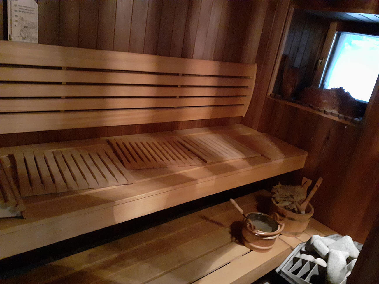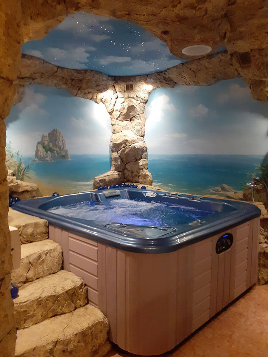 Отдохнуть после банных процедур или расслабиться после насыщенного трудового дня можно в современном гидромассажном бассейне (компании HotSpring). Небольшое помещение, в котором он установлен, напоминает природный грот на берегу моря. Нужное настроение здесь создают рельефный декор поверхностей, живописные панно на стенах и подсветка «звездное небо» на потолке.