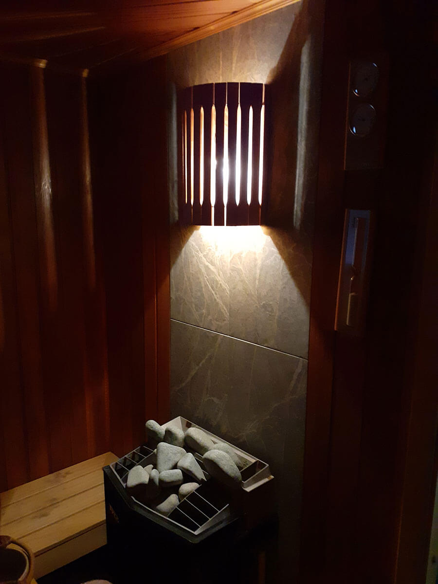 Из помещения бассейна предусмотрен вход в домашний хаммам. Он представляет собой современную паровую кабину (фирмы Tylo), рассчитанную на двоих. Технологически этот вариант вполне оправдан: в отличие от классической турецкой бани кабина быстро нагревается — в течение 15 мин. К тому же она очень проста в уходе и функциональна: снабжена аудиосистемой и оборудованием для ароматерапии. Рядом спланирована сауна, которую могут одновременно посещать три-четыре человека. Стены парной обшиты кедром, полки выполнены из древесины абаши. Стальная банная печь (компании Tylo) имеет специальное необжигающее покрытие, стена за ней облицована теплоемким талькохлоритом.