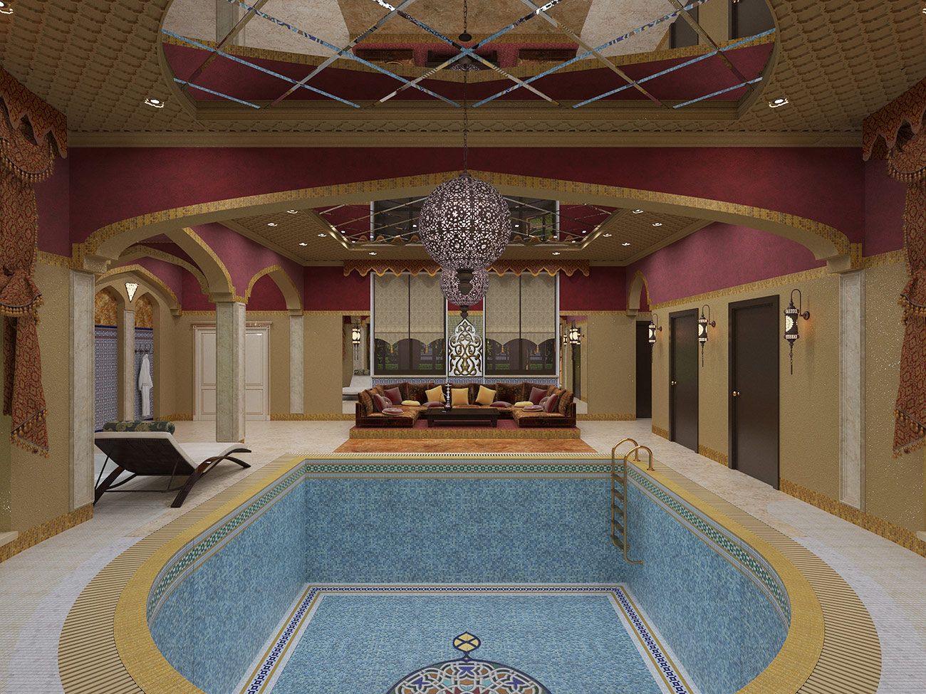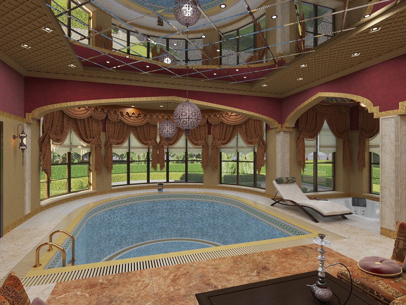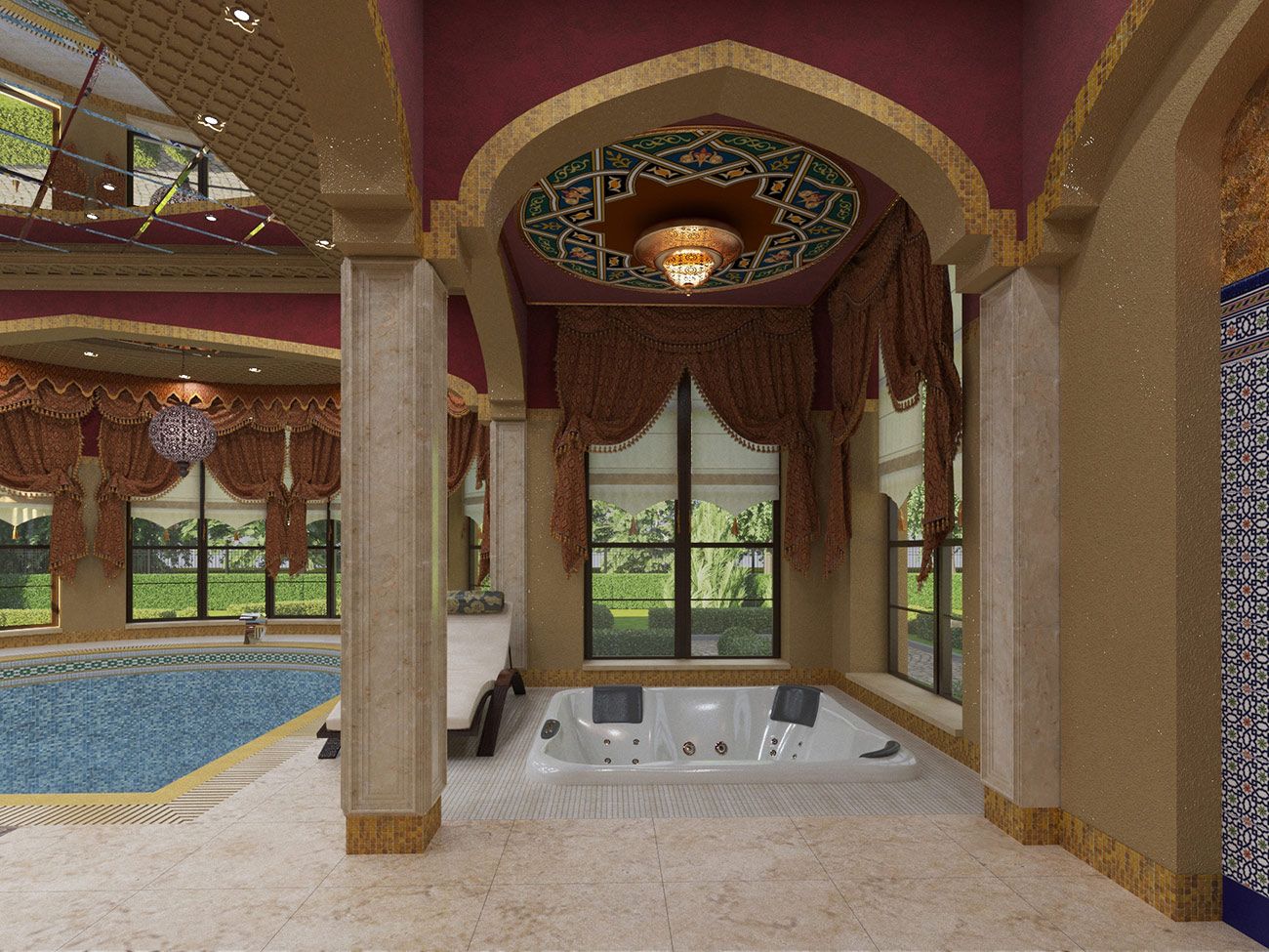 Спа в восточном стиле в коттеджном поселке «Миллениум парк» на Новорижском шоссе. Помещение частного бассейна является пристроенной частью к открытой террасе загородного дома. Вместо крыши приняли решение сделать открытую террасу с выходом со второго этажа. По данному проекту пристройки на основании архитектурного проекта разрабатывался конструктивный проект совместно с инженером-конструктором, который производил расчет фундамента, необходимых нагрузок и усилений.