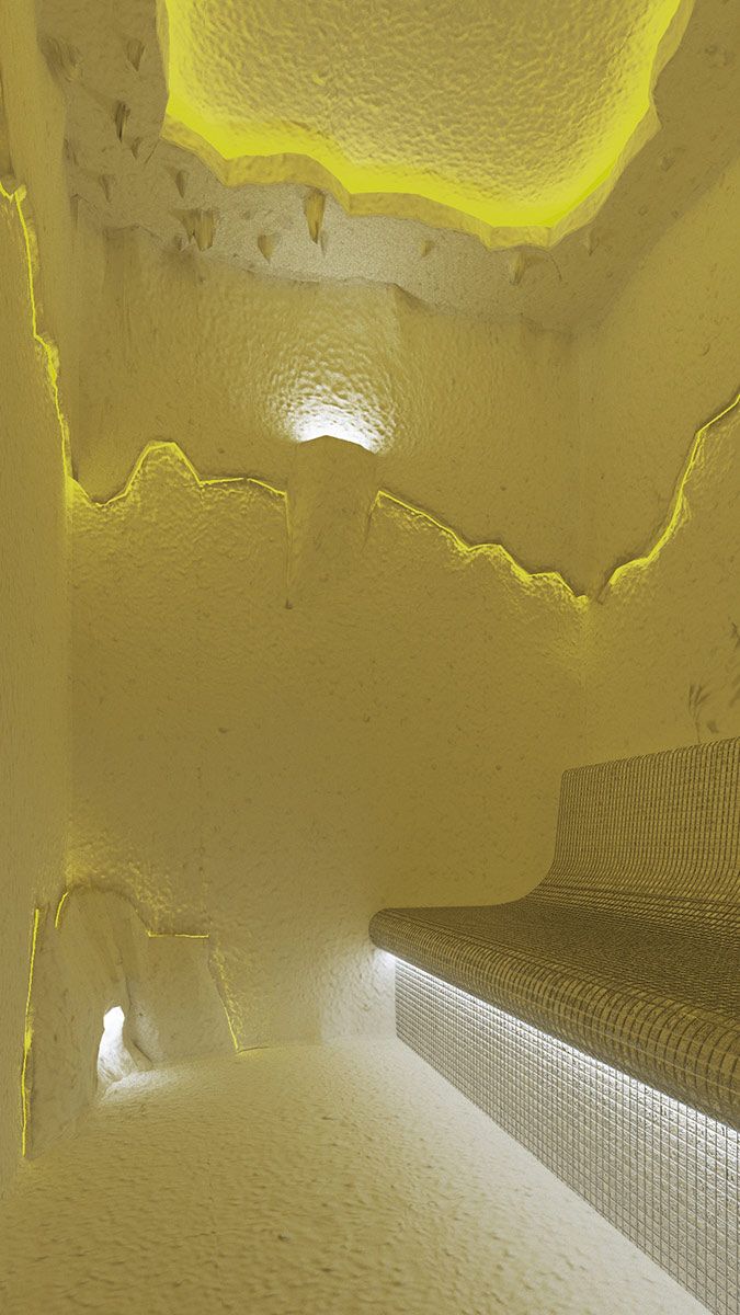 Зона отдыха украшена декоративными нишами, внутри которых располагаются гипсовые панели Artpole в восточном стиле с декоративными стеклами, между нишами — мозаичное панно ручной работы.