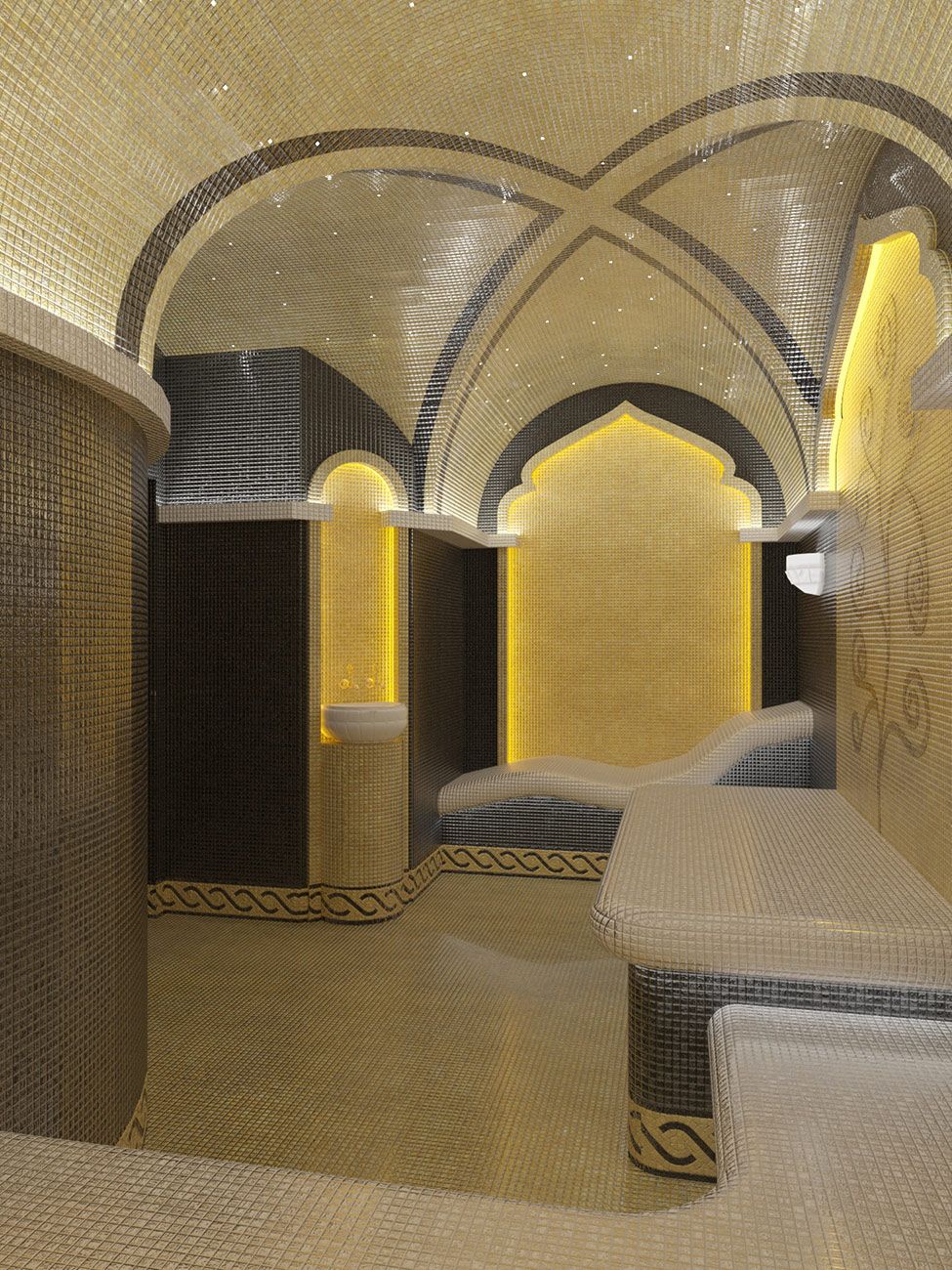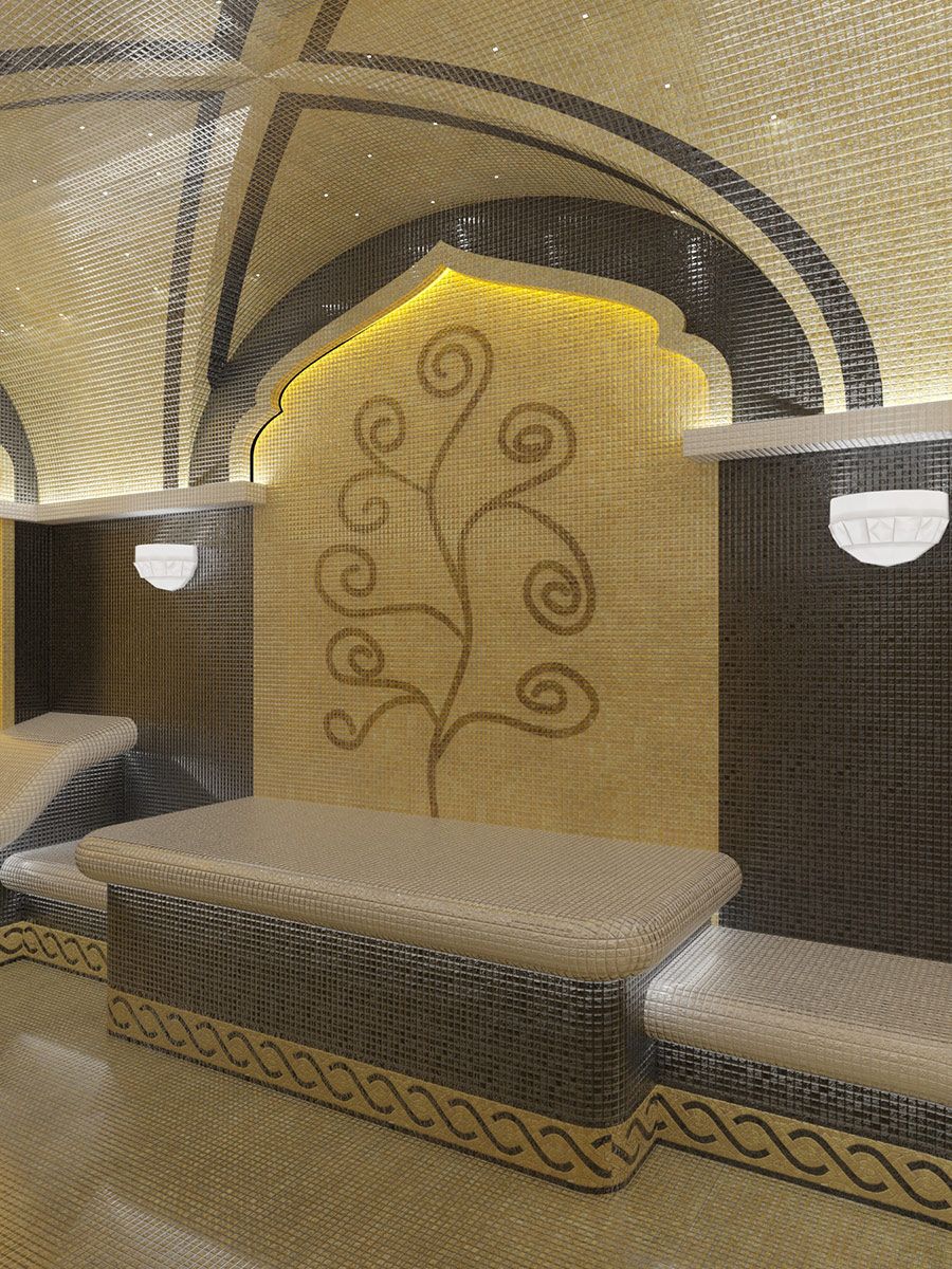 Хаммам турецкий, в золотистой мозаике, с бордюром из черной мозаики. Потолки хаммама также облицованы мозаикой с подсветкой внутри.