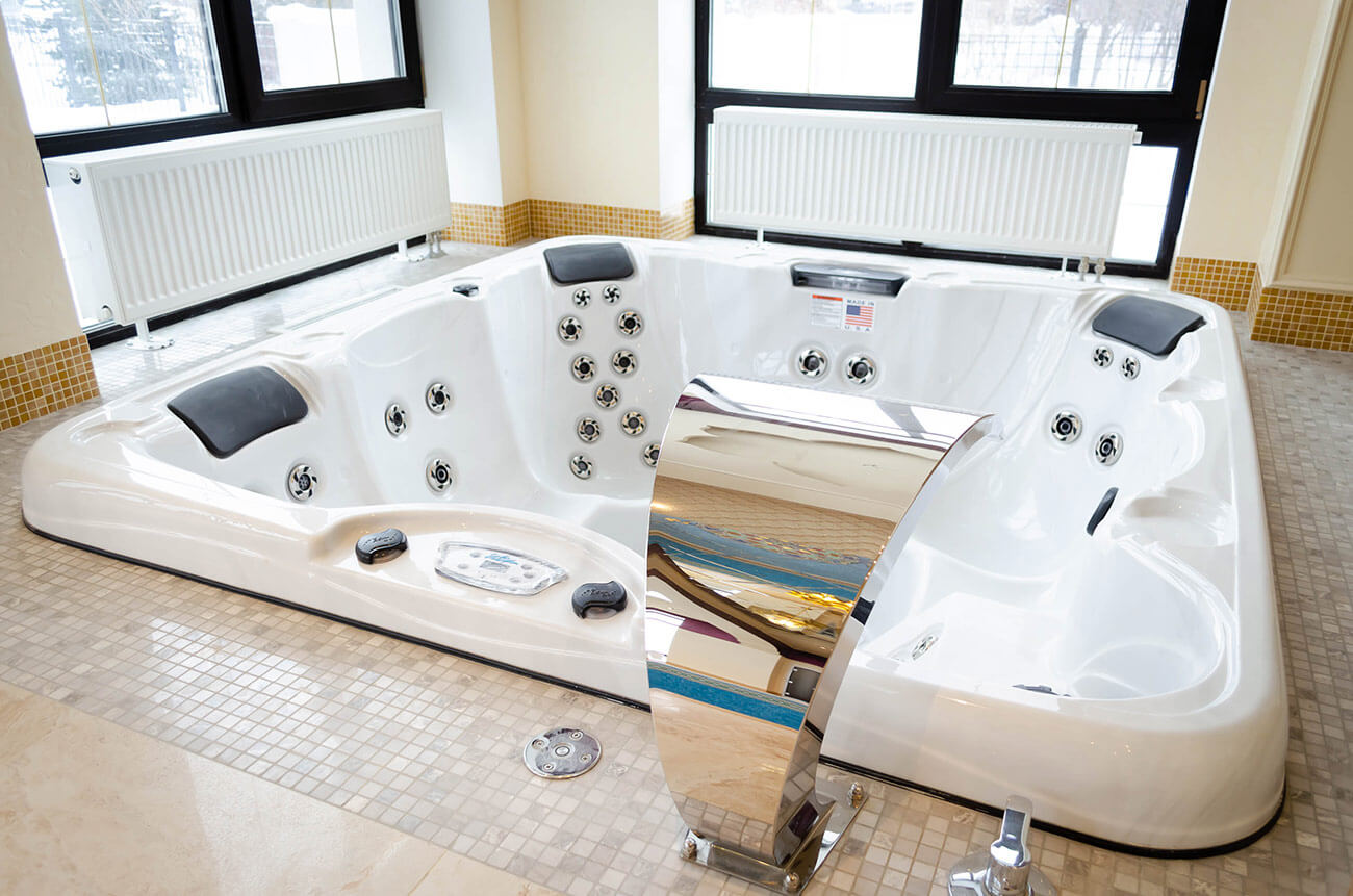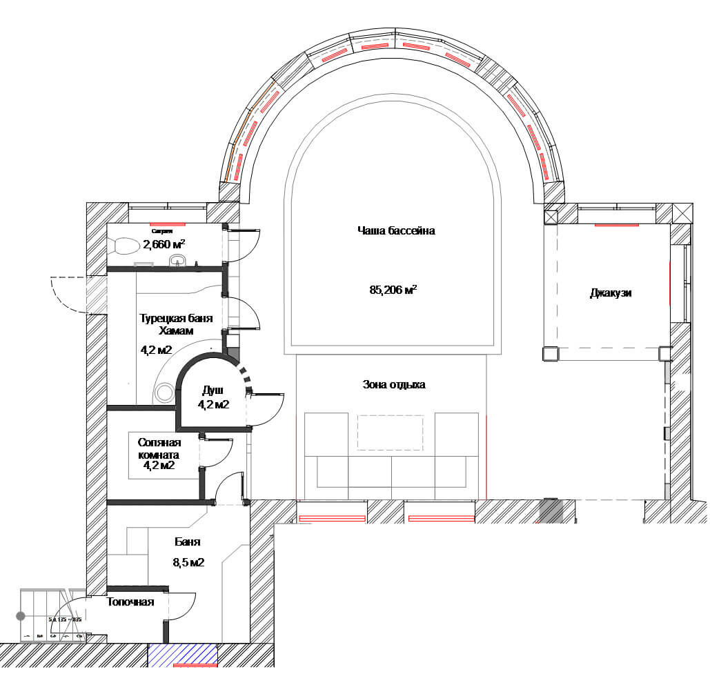 По планировочному решению получились следующие зоны: непосредственно зона чаша бассейна, зона джакузи и зона отдыха, общая площадь 85 кв. м, остальную площадь занимают такие функциональные помещения, как санузел, хаммам, соляная комната, душевая и русская баня.