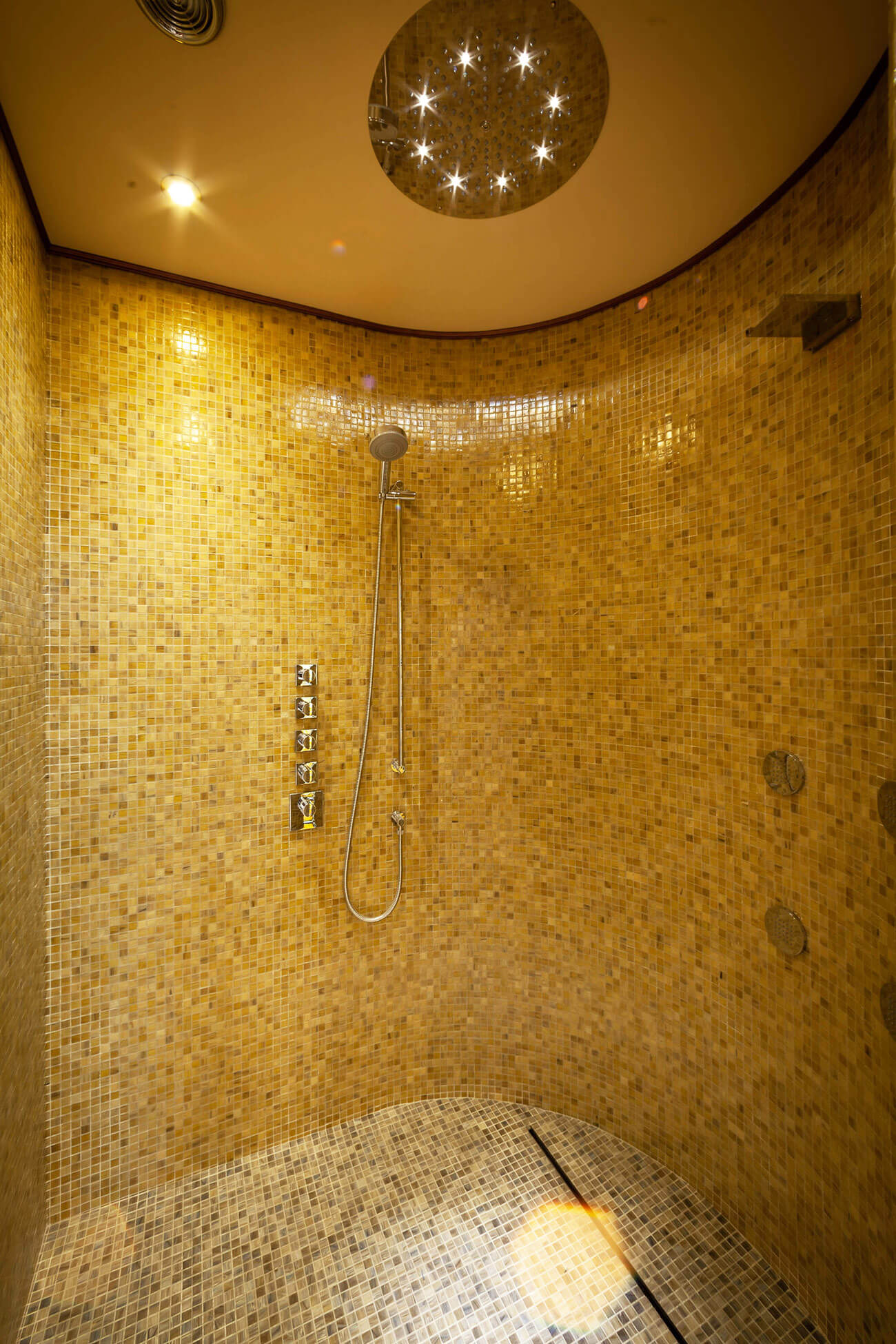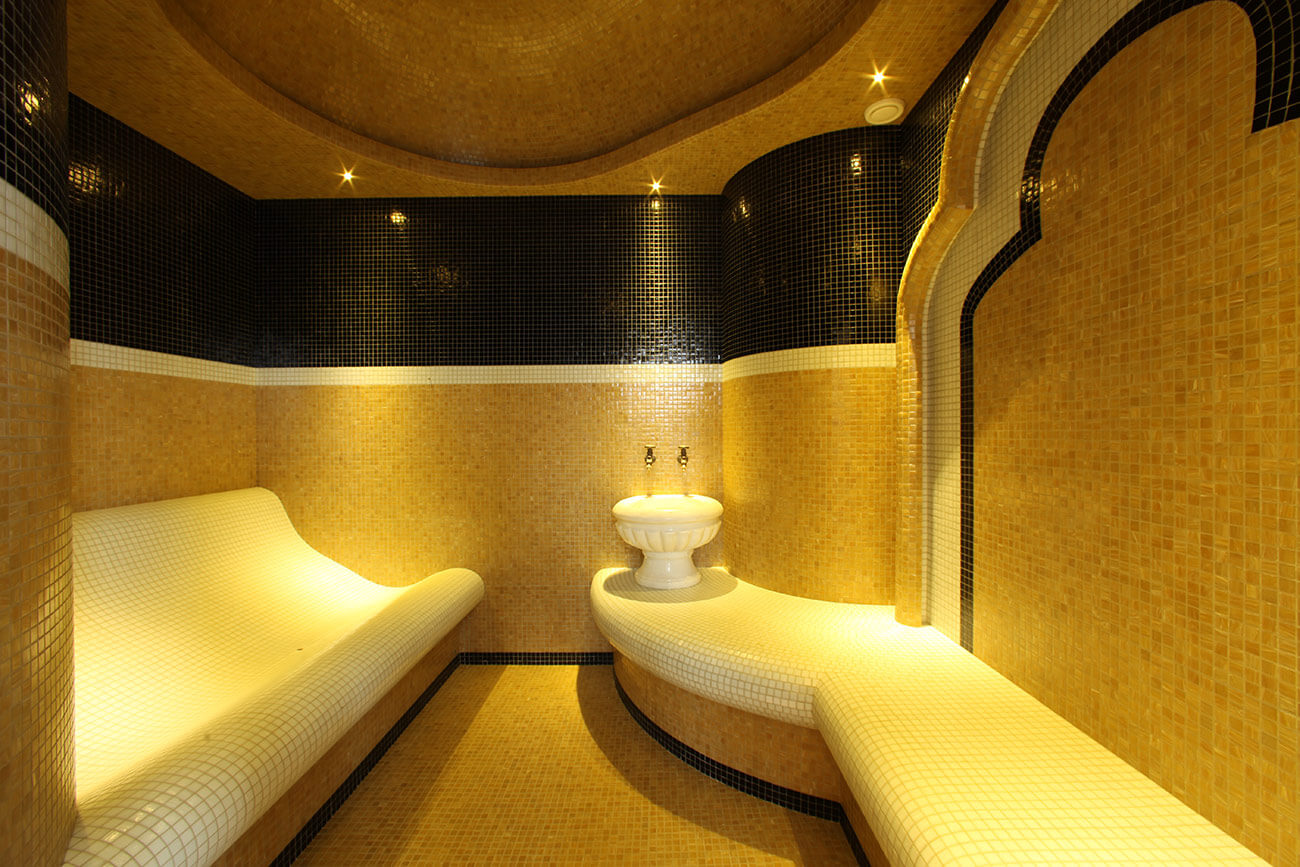 Хаммам турецкий, в золотистой мозаике, с бордюром из черной мозаики. Потолки хаммама также облицованы мозаикой с подсветкой внутри.